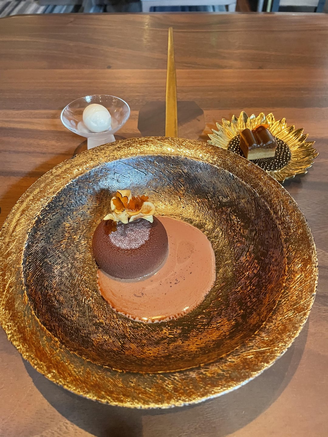 * Dessert: sunchoke semifreddo encased in chocolate finished tableside with more chocolate sauce and served with vanilla bean ice cream and mochi