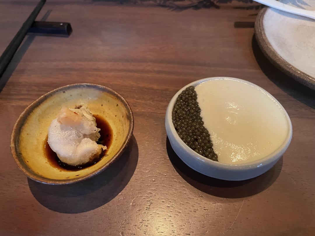 * Potato purée with osetra caviar and tempura fried ? in ponzu sauce