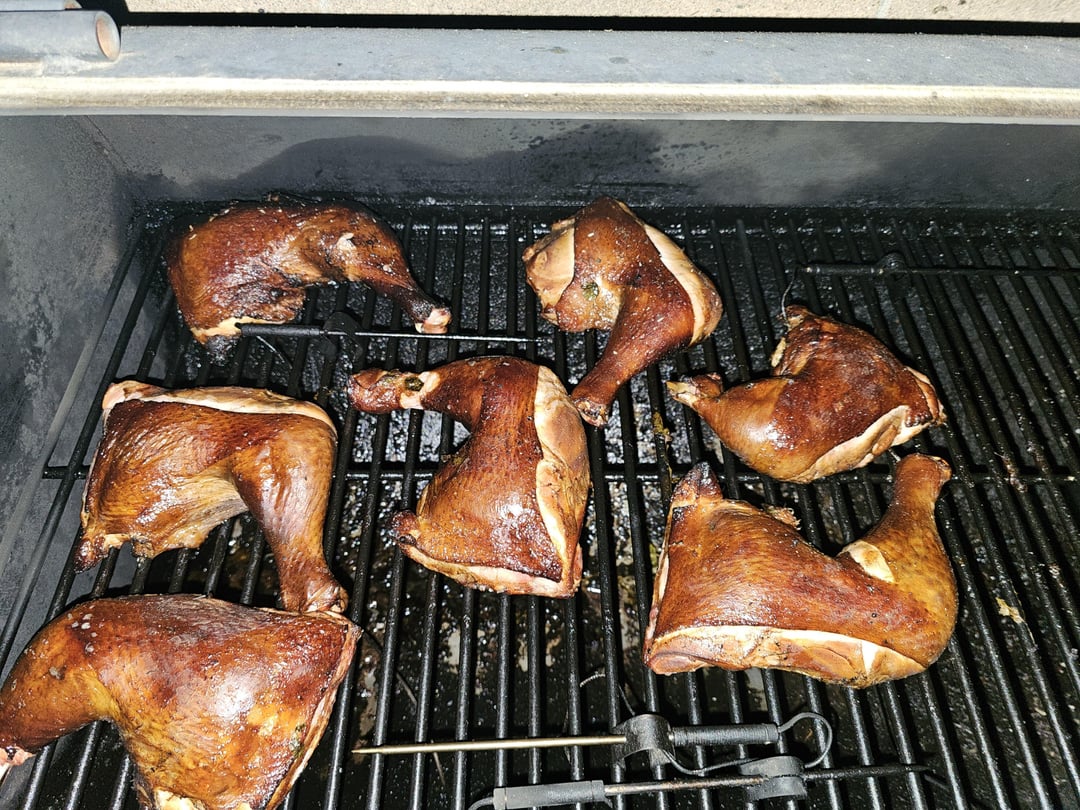 I smoked chicken quarters at around 350-400 degrees till they reached 175-180 internal. Marinated in orange, lime and mandarin juice with black pepper, garlic powder, cumin and paprika.