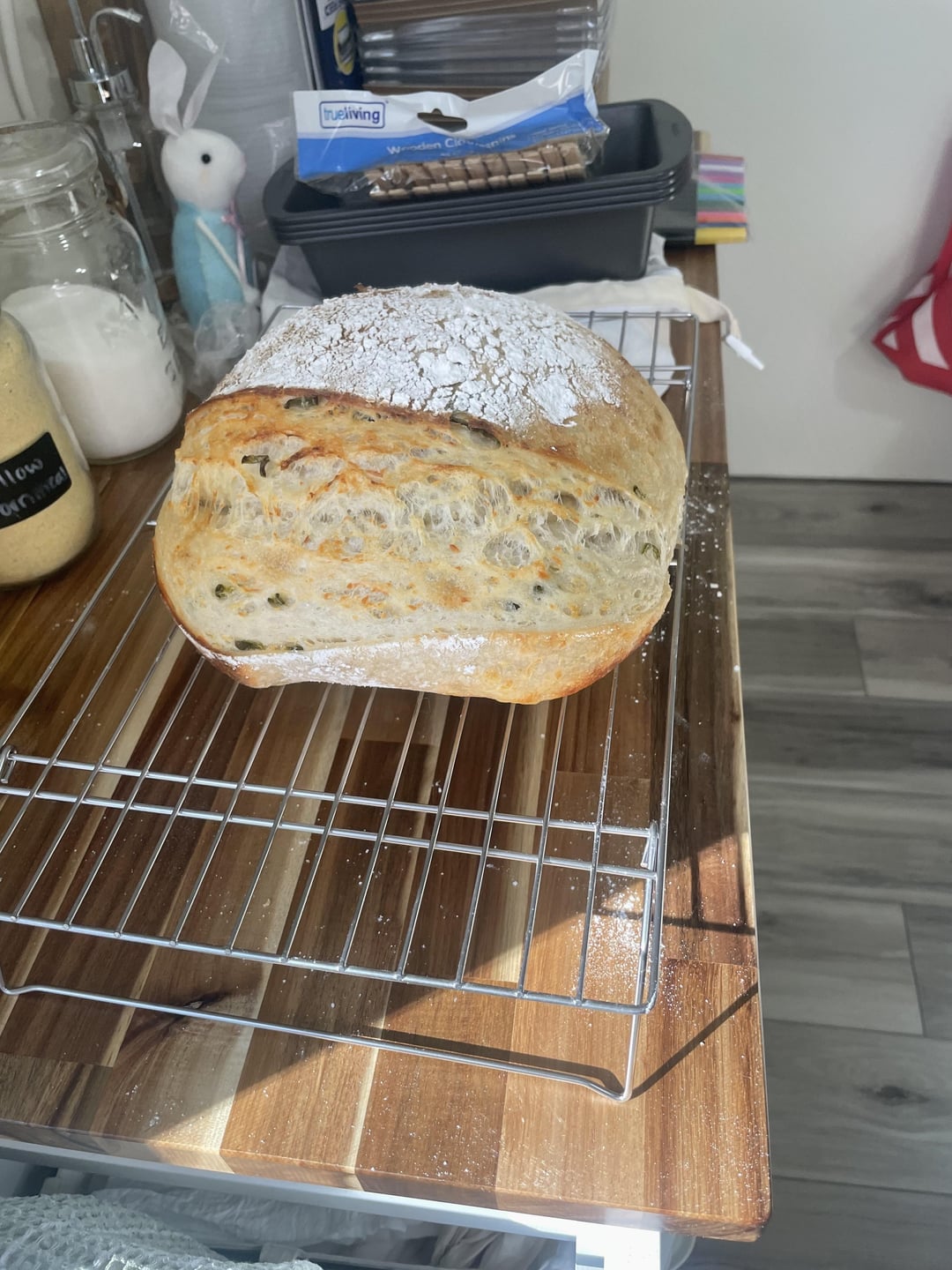 Mixed, did stretch and folds ever 45 mins, two without inclusions, two with jalapeños and cheddar. Let proof on counter for… 6 hrs total? Until there were bubbles at edge, not sticky.