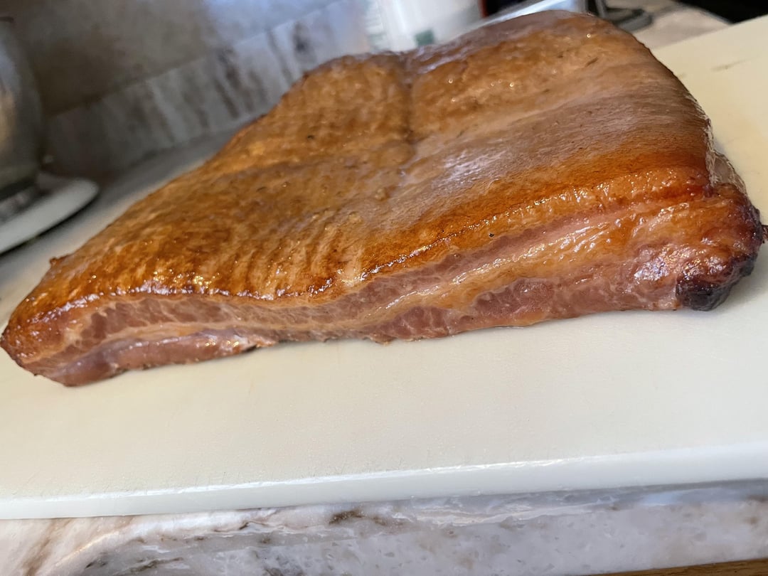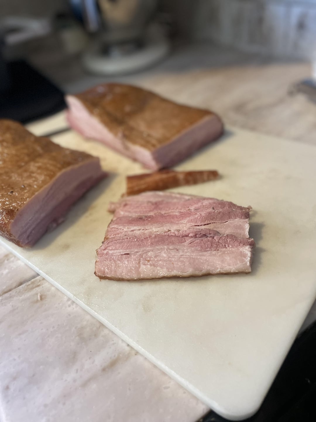 Smoked at 275 over pecan wood and pulled at 150 internal. Don’t have a deli slicer so super thick cut bacon strips with a bread knife. Freezes real well too. Definitely recommend!