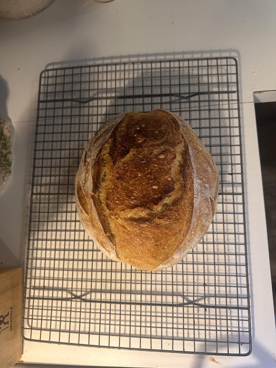 Probably my 10th loaf. I feed my starter a 1:10:10 ratio, typically with bread flour and warmed spring water. I’ve had my starter in the works for a couple months and saw the best results in its activity and strength when I started feeding it daily with the 1:10:10 ratio.