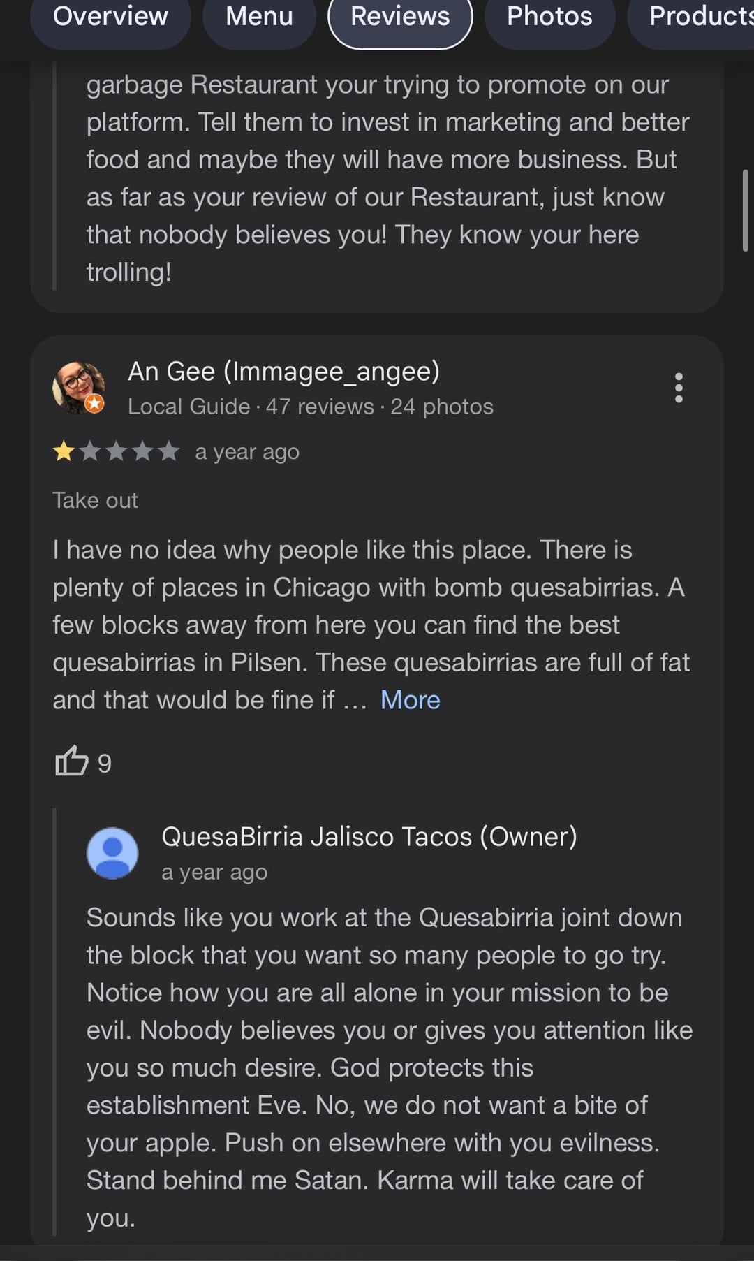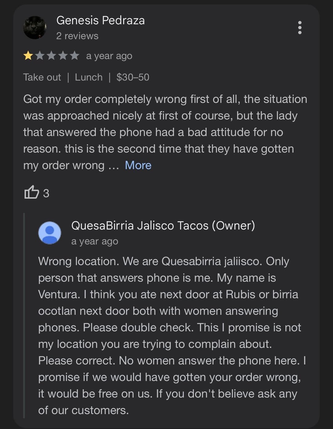 The owner of QuesaBirria Jalisco gets defensive in reviews lol