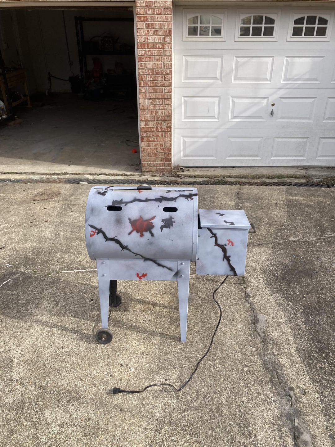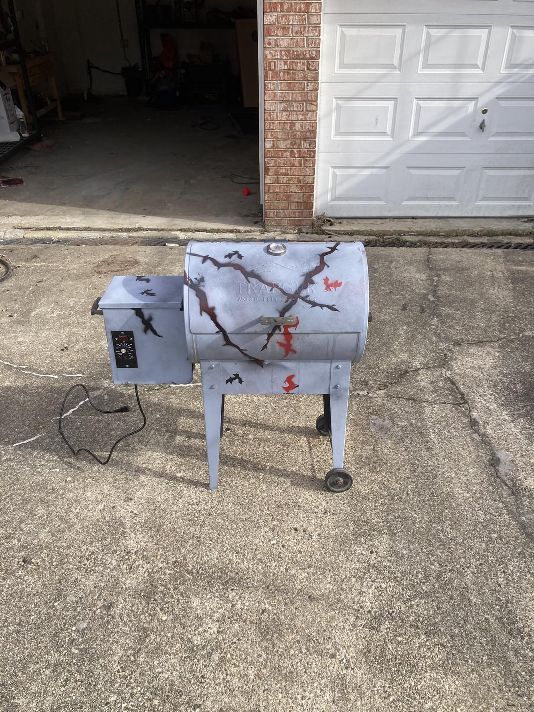 Found an old Traeger for $40 at a Restore place (basically goodwill for furniture) and decided to take a chance on it. Cleaned it up, replaced the electronics and decided to try and paint it to look like cracked stone, and it works like a dream.