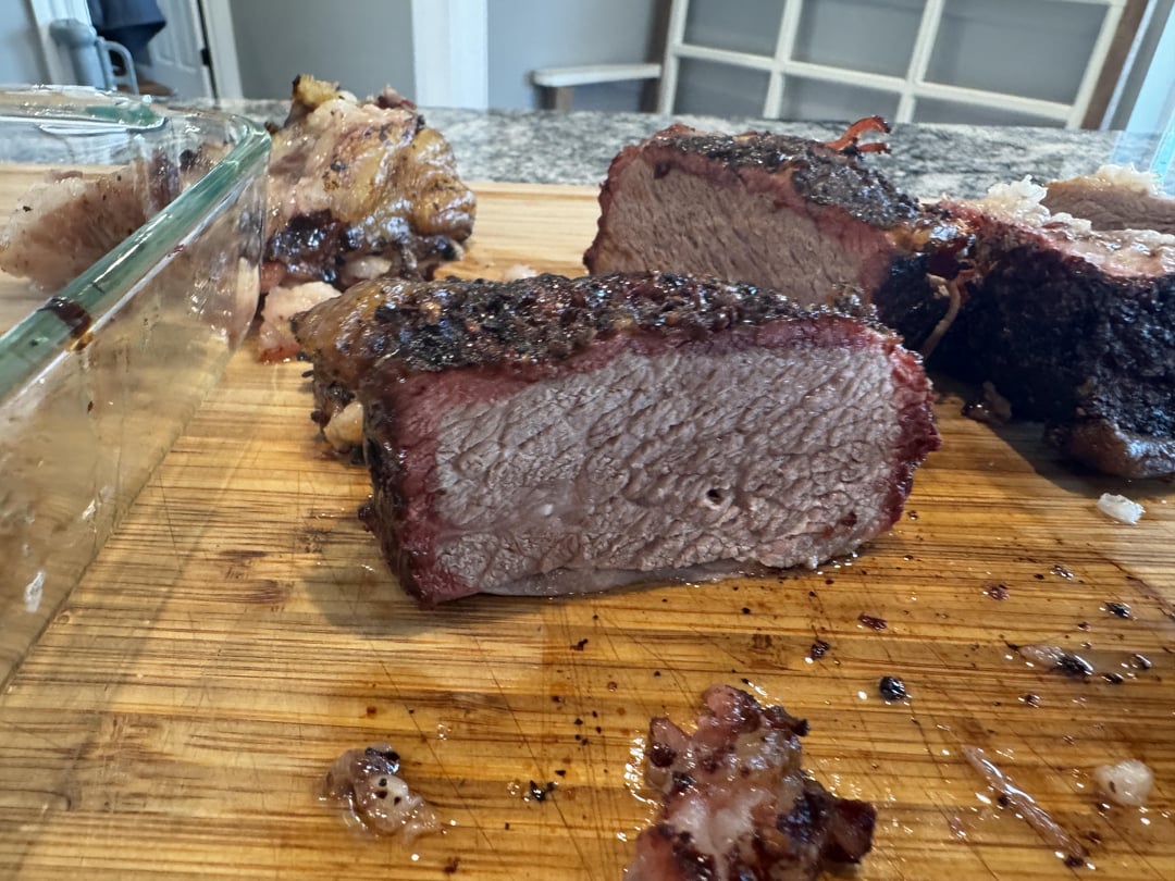 Beef short ribs. 6 hours at 225 degrees. 1 hour at 350 degrees. The dog is happy.