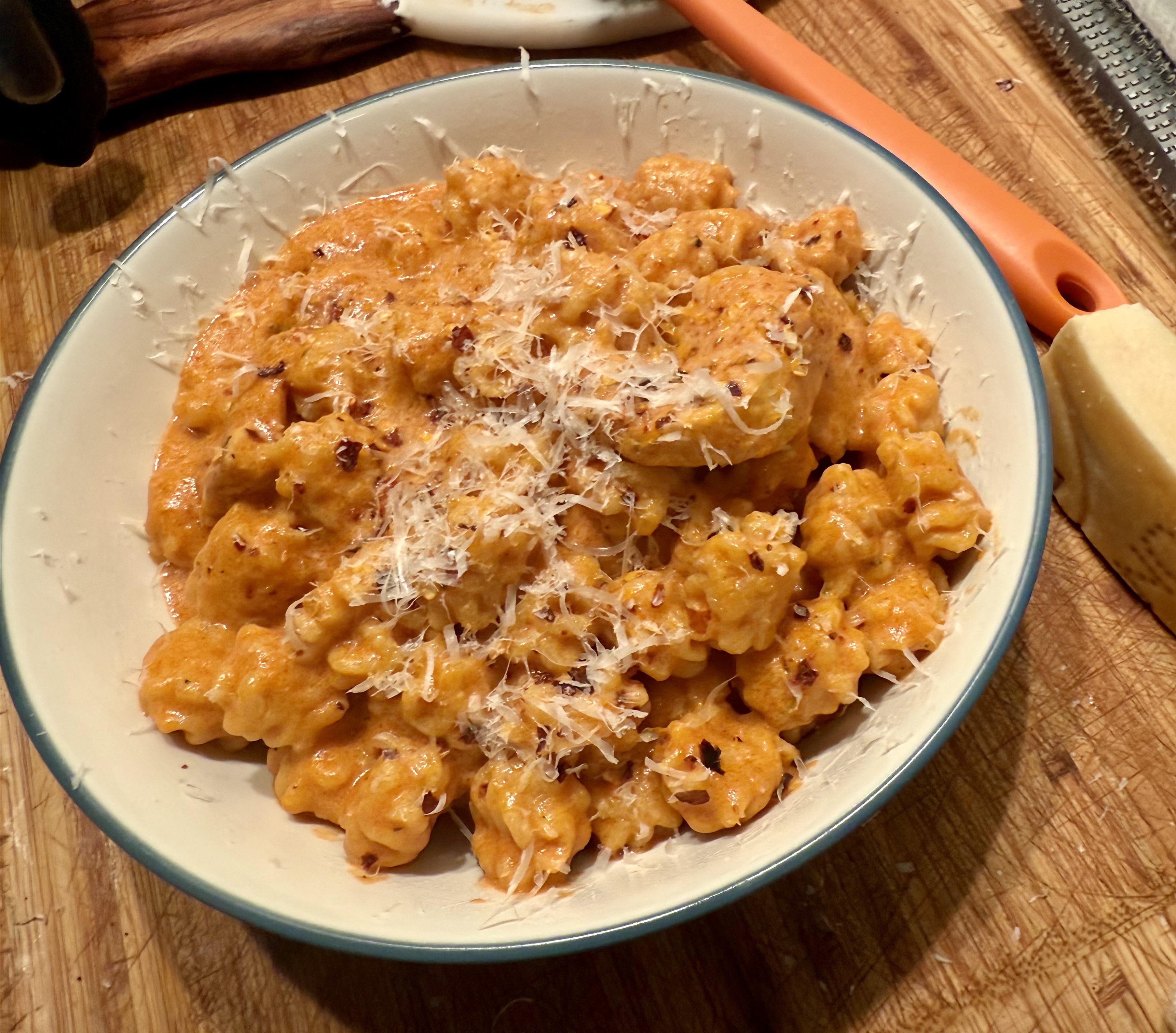 Add it back to the skillet, add the chicken, butter and freshly grated parm. Let it simmer and thicken.