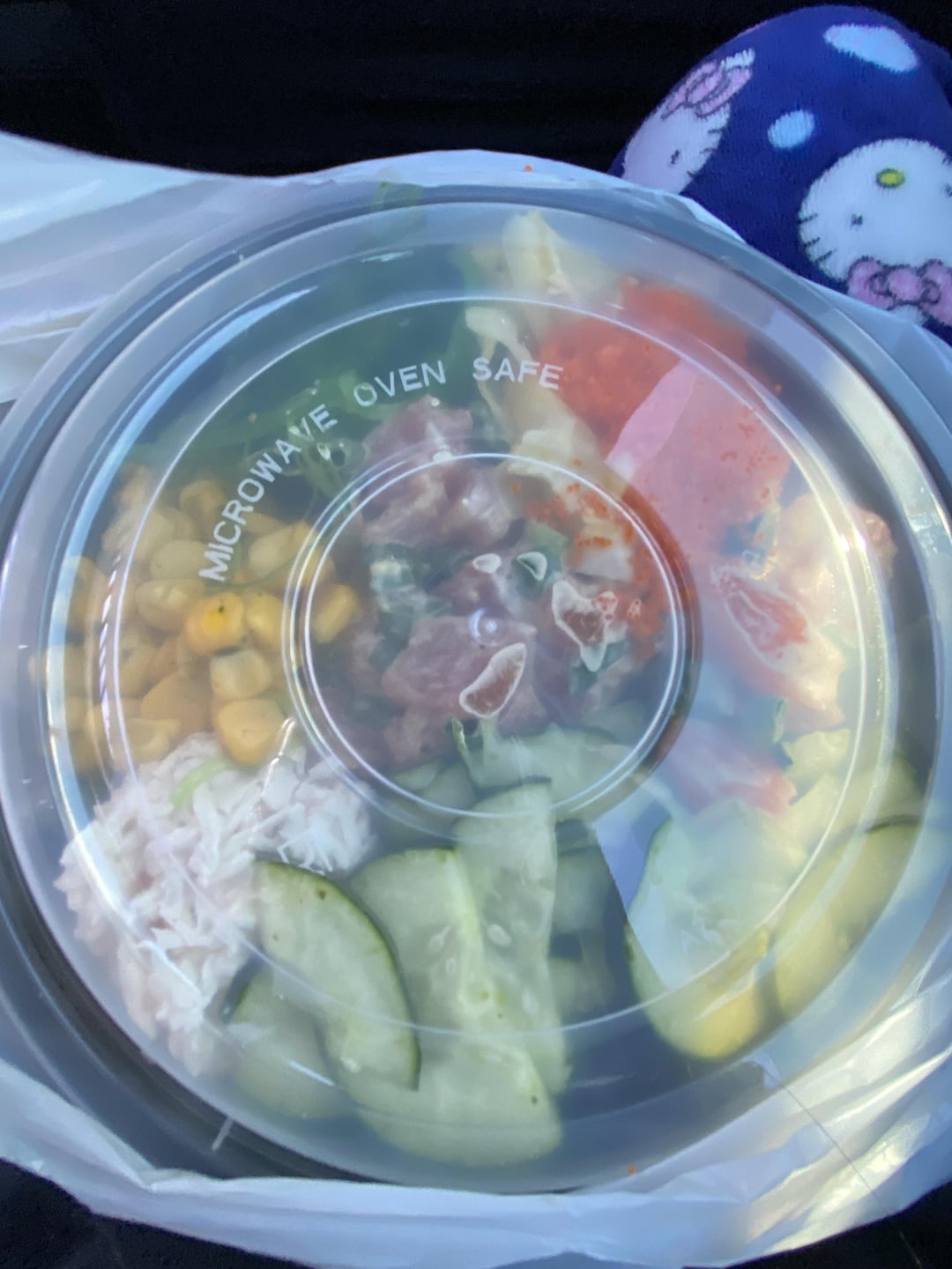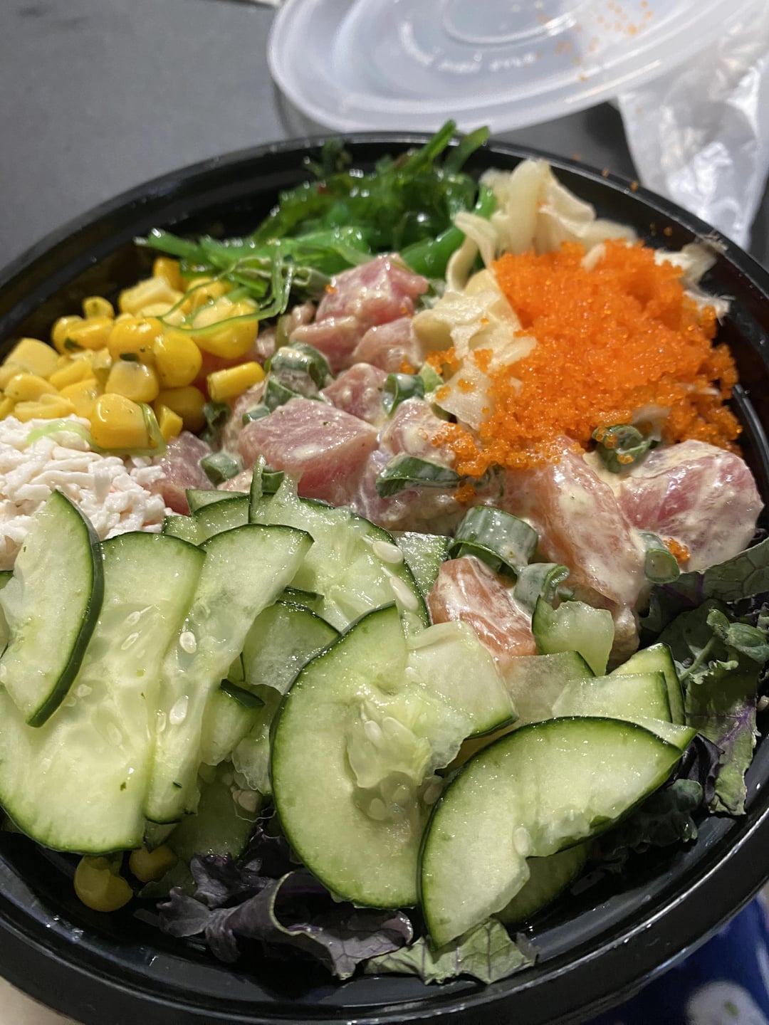 It’s a poke bowl. The base is half kale mix with half hula rice. Two scoops of tuna, one scoop of salmon, corn, cucumbers, crab meat, seaweed salad, and light on the sauce.