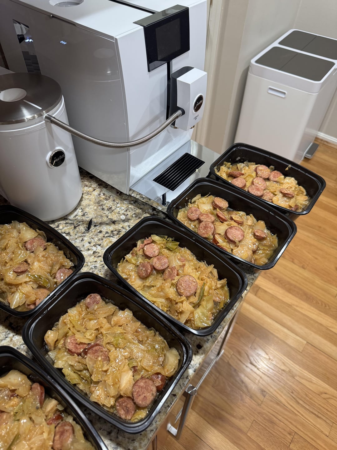 Followed a popular YouTube recipe and rough chopped a whole green cabbage, 2 onions. Cooked them with 2 types of andouille sausage from the store, with salt pepper and lots of garlic.