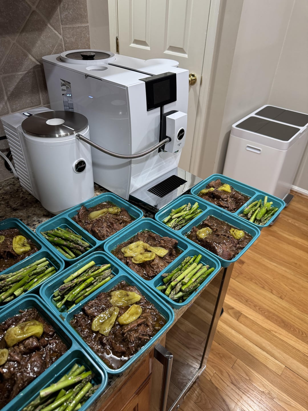 Dry rubbed Chicken thighs in the oven, broccoli & asparagus in the steamer, Mississippi pot roast in the French Oven, andouille sausage with Cajun cabbage and onions in the crock pot.