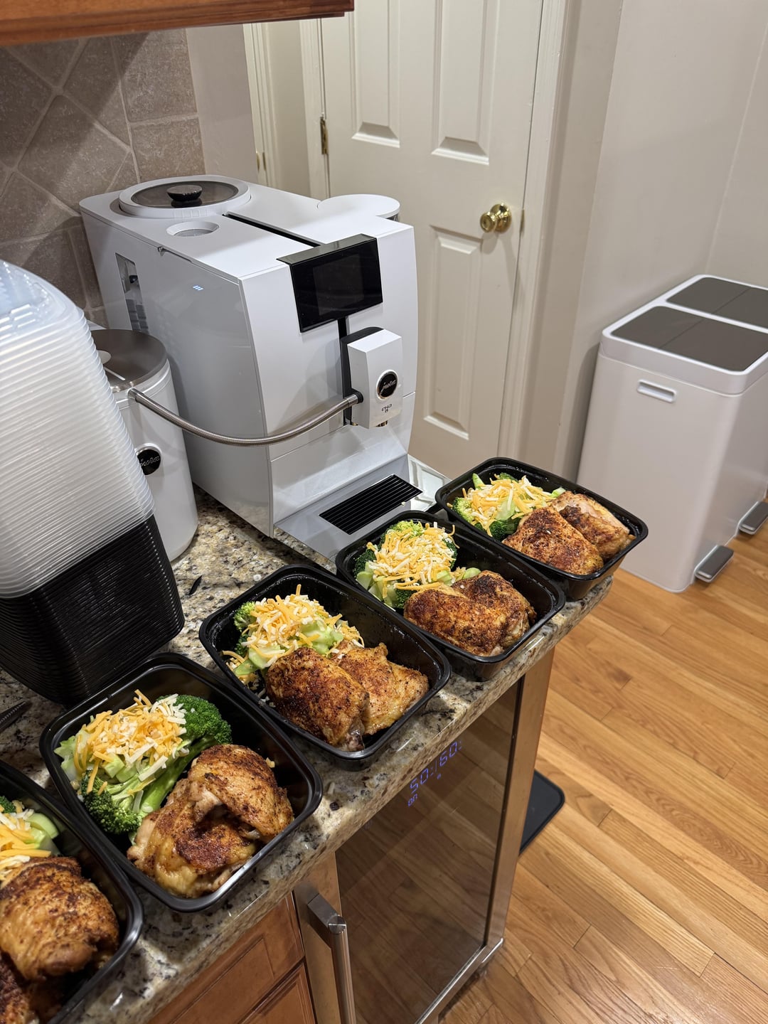 Chicken thighs seasoned generously with Cajun two step hot. Cooked for 50min @ 375° on a wire rack. Served with gently steamed broccoli and cheese. Designed to finish cooking in the microwave.