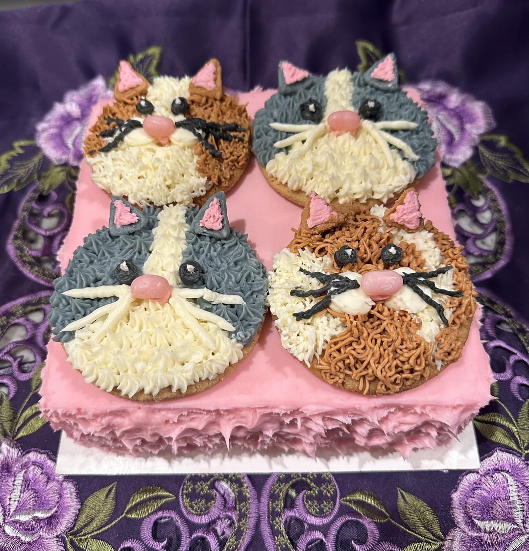 Iโm part of a group that makes birthday cakes for kids in foster care. The kids range in age from 1-19; they (or their guardians) chose the theme and flavor. This 10 year old girl chose cats and cookies and cream. The cats are sugar cookies. ๐