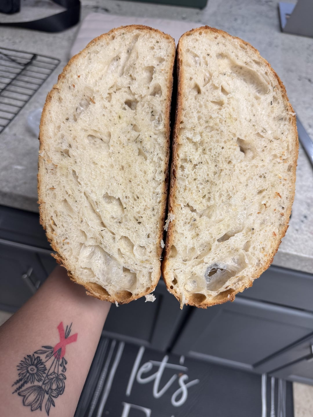 Added fresh minced garlic, fresh grated Parmesan and Italian herb seasoning during 2nd and 3rd stretch and folds