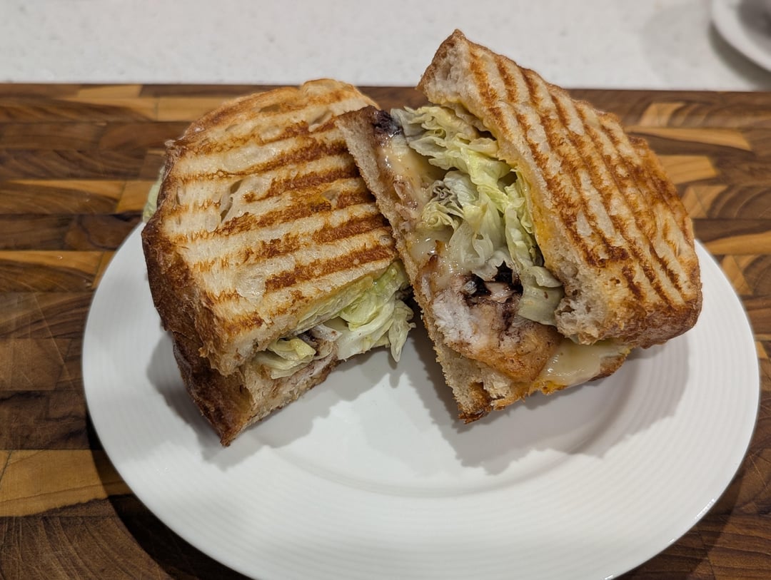 Korean style chicken breast, secret sauce, iceberg lettuce, Port Salut AOP cheese, cracked pepper, spiced grape sauce, toasted sourdough.
