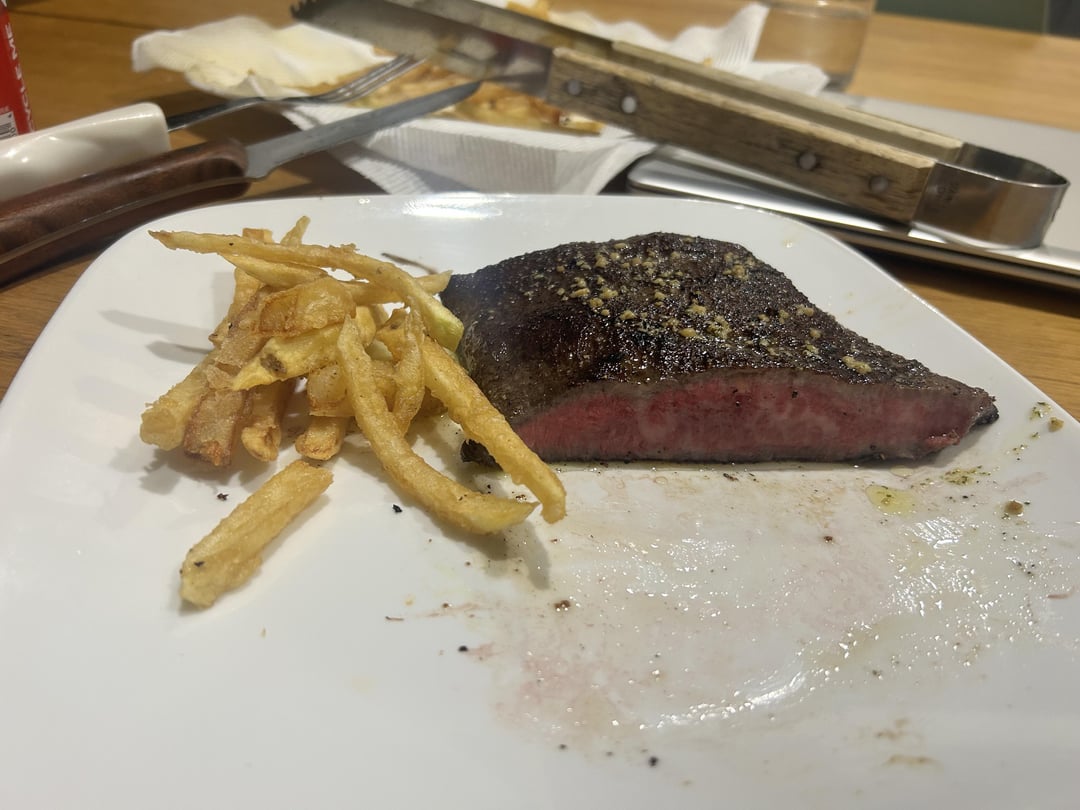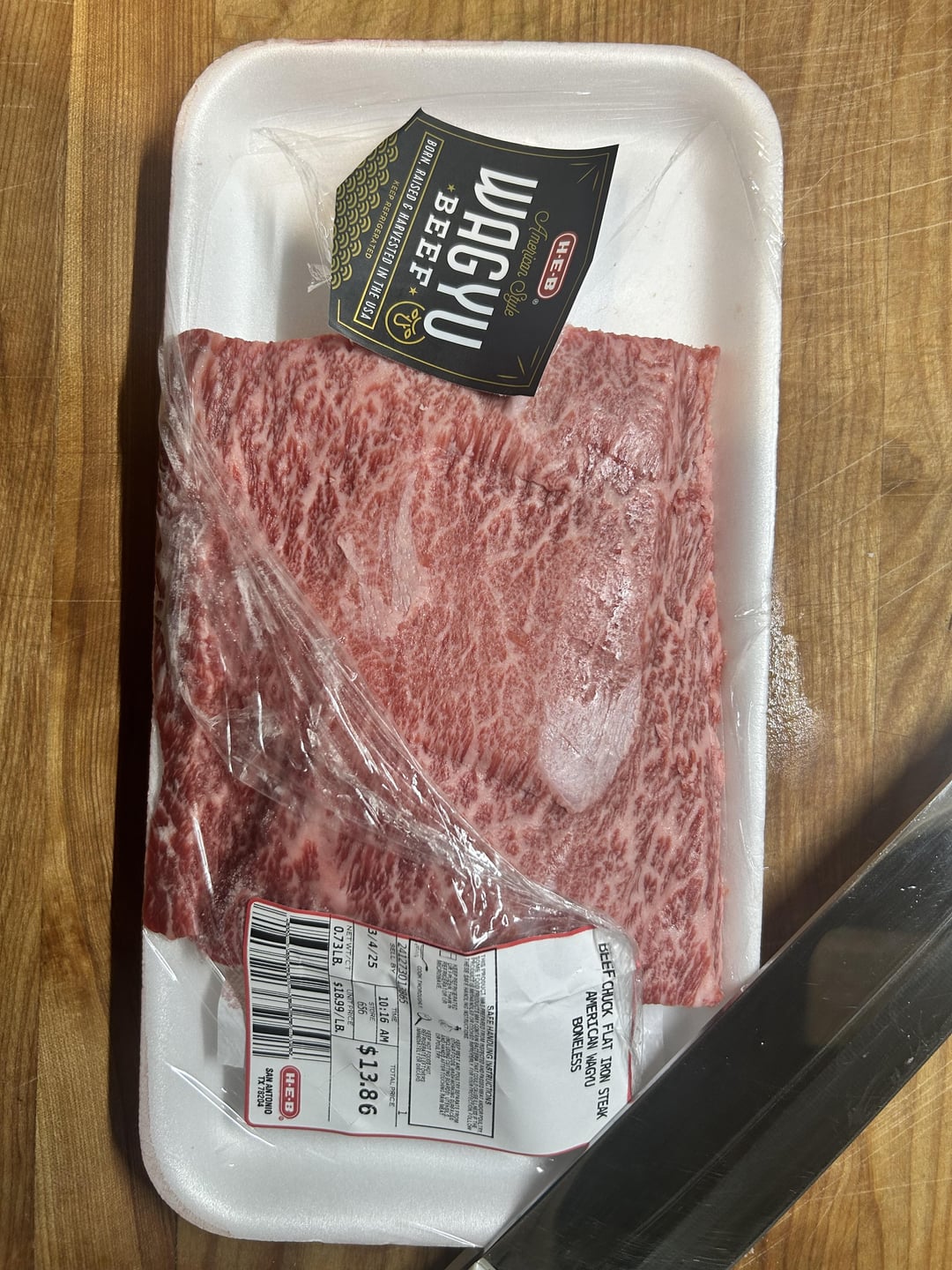 I cannot believe I found this thing for 14 bucks. I seared it in a good ol cast iron. Sear-rest-sear-rest-eat. Ate it with some homemade French fries and one of HEBs garlic butter dollops.