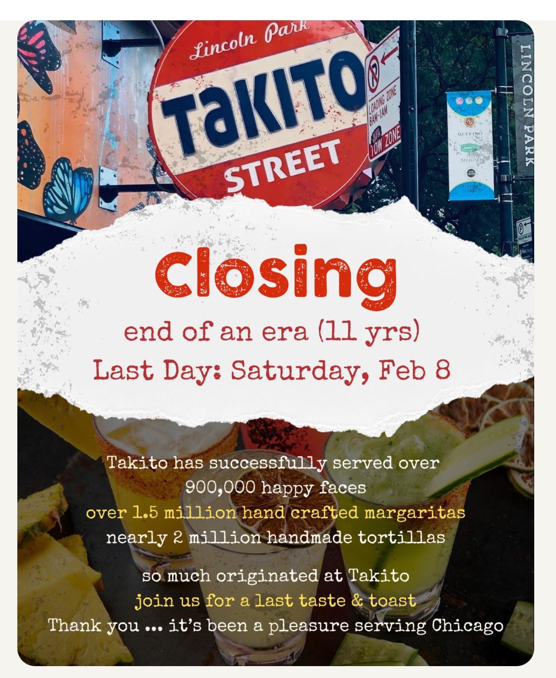 Hurry! Today and tomorrow are the last days for Takito Street Lincoln Park. Fond memories here. by SunshineLoveKindness Write A CommentYou must be logged in to post a comment.
