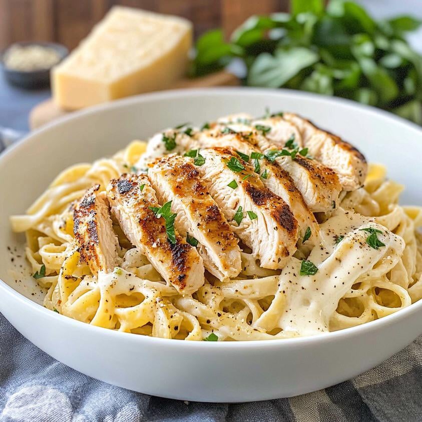 WhatAboutUu 12 months ago The instructions and full recipe here: https://www.ariasrecipes.com/delicious-chicken-alfredo-recipe/Ingredients1 lb boneless, skinless chicken breasts 8 ounces fettuccine ¾ cup heavy cream 5 ounces grated Parmesan cheese 4 tablespoons unsalted butter 3 cloves garlic, minced 1 tablespoon all-purpose flour Salt and pepper to taste 1 tablespoon olive oil Fresh parsley, for garnish