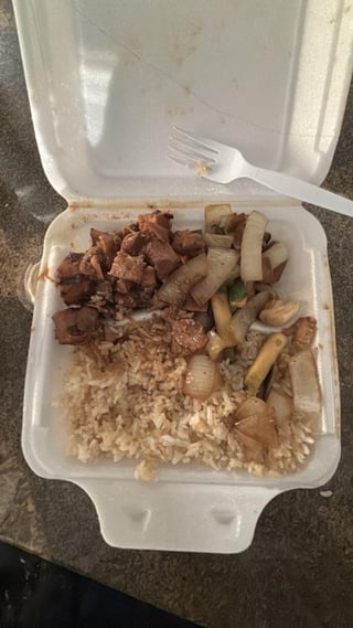 No_Plantain_2062 11 months ago It is not as bad as ppl are saying.I would say like 1 cup of white rice max.2 tablespoons of teriyaki sauce to be generous.3.5 ounces of chicken at best?Then cooked onions and zucchini.Even adding a tablespoon of oil just to be safe it comes to 630 cals which is the high value:[https://tools.myfooddata.com/recipe-nutrition-calculator/172336-169292-170004-172890-173625-168878/wt1-wt1-wt9-wt1-oz-wt1/1-0.5-1-1-3.5-1/1](https://tools.myfooddata.com/recipe-nutrition-calculator/172336-169292-170004-172890-173625-168878/wt1-wt1-wt9-wt1-oz-wt1/1-0.5-1-1-3.5-1/1)500 calories if you make it 3/4 cup rice, 1 tablespoon of teriyaki, and 1/2 tablespoon of oil (since it doesn’t look that oily). You’re good. Normal meal IMHO.