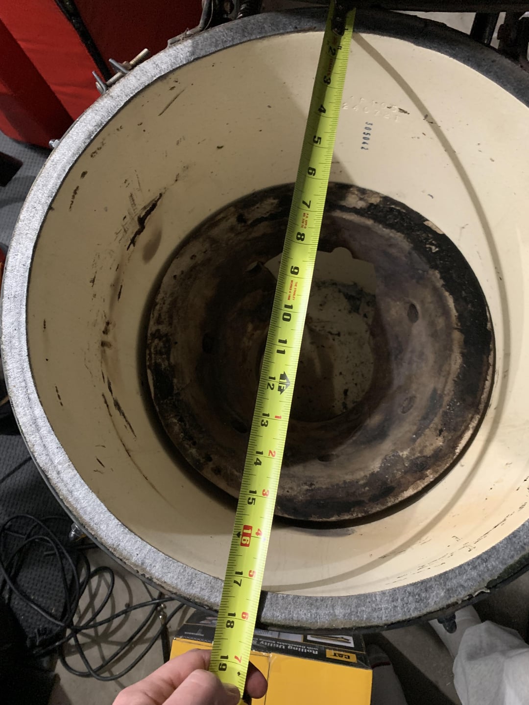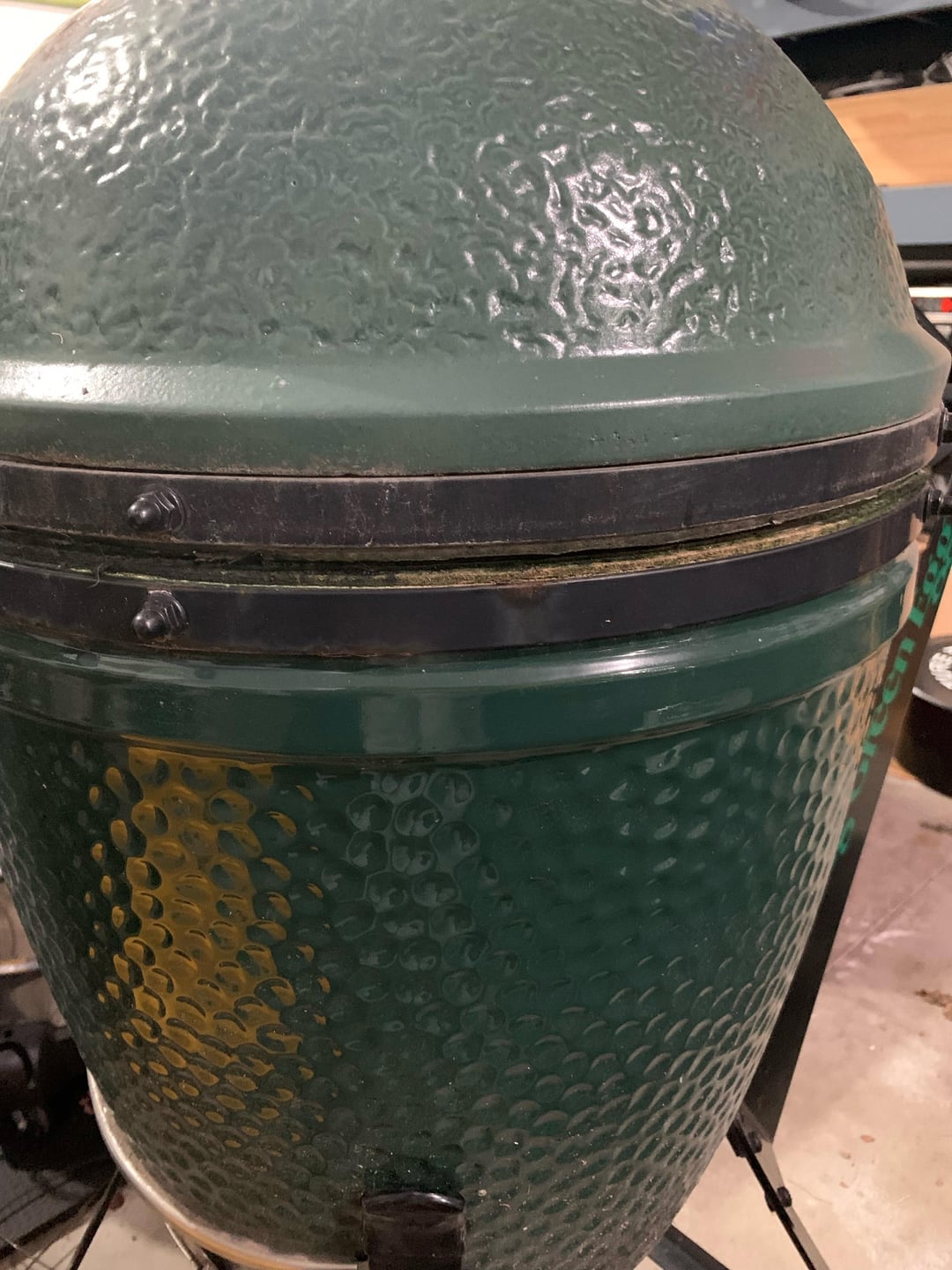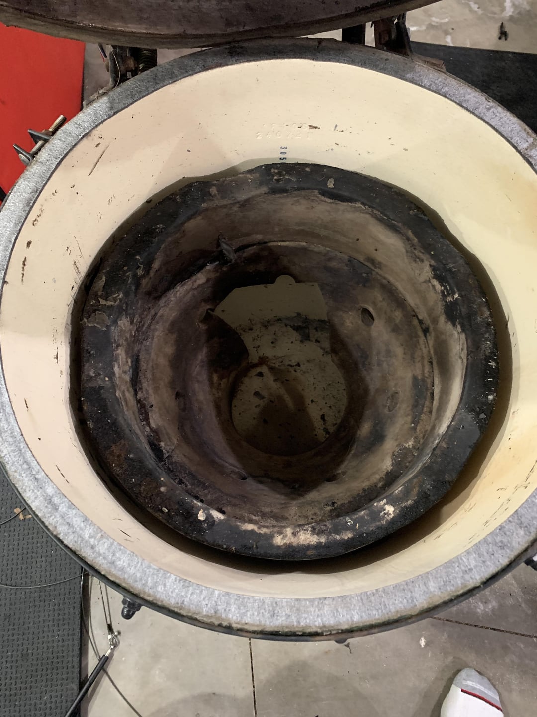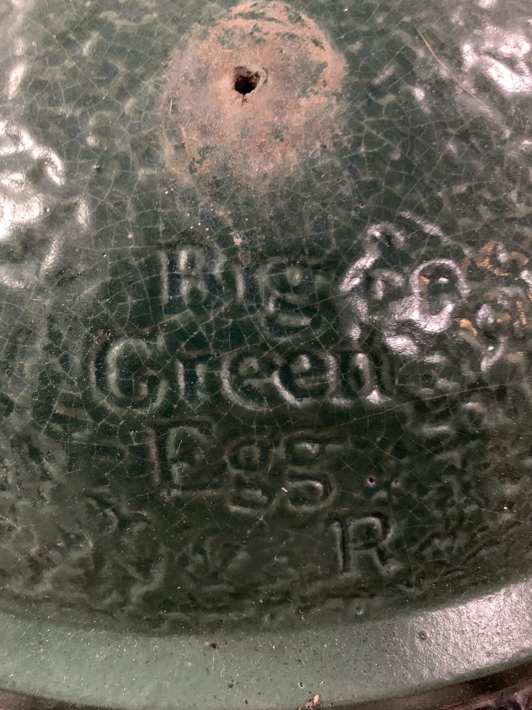I picked up this medium BGE from an estate sale for $50. They didn’t know anything about it. The broken piece of the fire bowl wasn’t with it and it’s also missing the bottom grate. It looks like the base must have been replaced at some point too because it’s pretty clean inside and the exterior has a different texture than the lid.