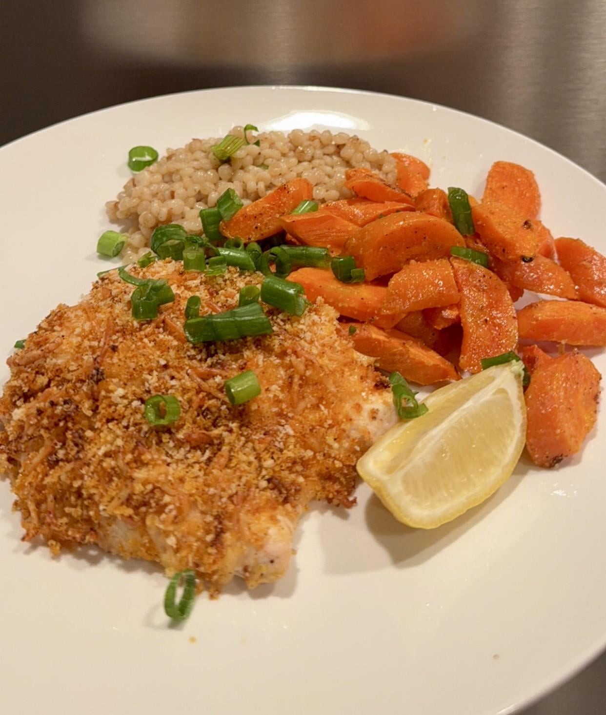 With garlic scallion couscous and lemony roasted carrots. 10/10 would eat again