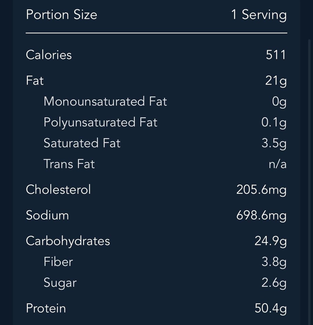 Low calorie (about 1/3 of my intake for the day) and high protein (about 50g) per serving.