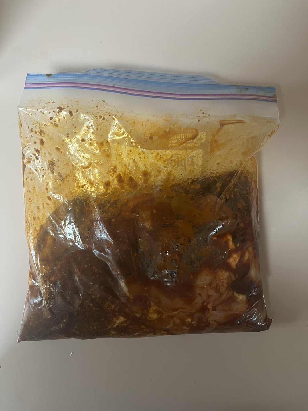 Combine all ingredients into a bag or container, and mix thoroughly. Let marinate for 2-3 hours.