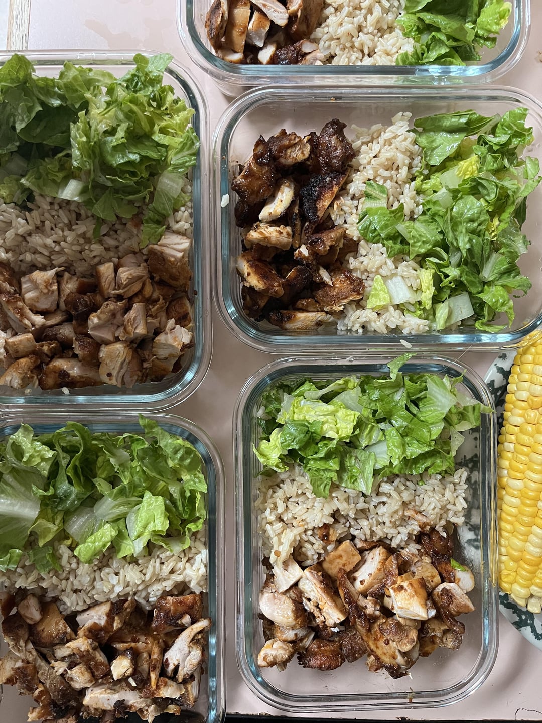 I combined the chicken with romaine lettuce hearts chopped, and ~0.4 cups of brown rice. I also boiled 2 cobs of corn and chopped for topping. Sauce is homemade salsa, found [here](https://www.thechunkychef.com/restaurant-salsa/).