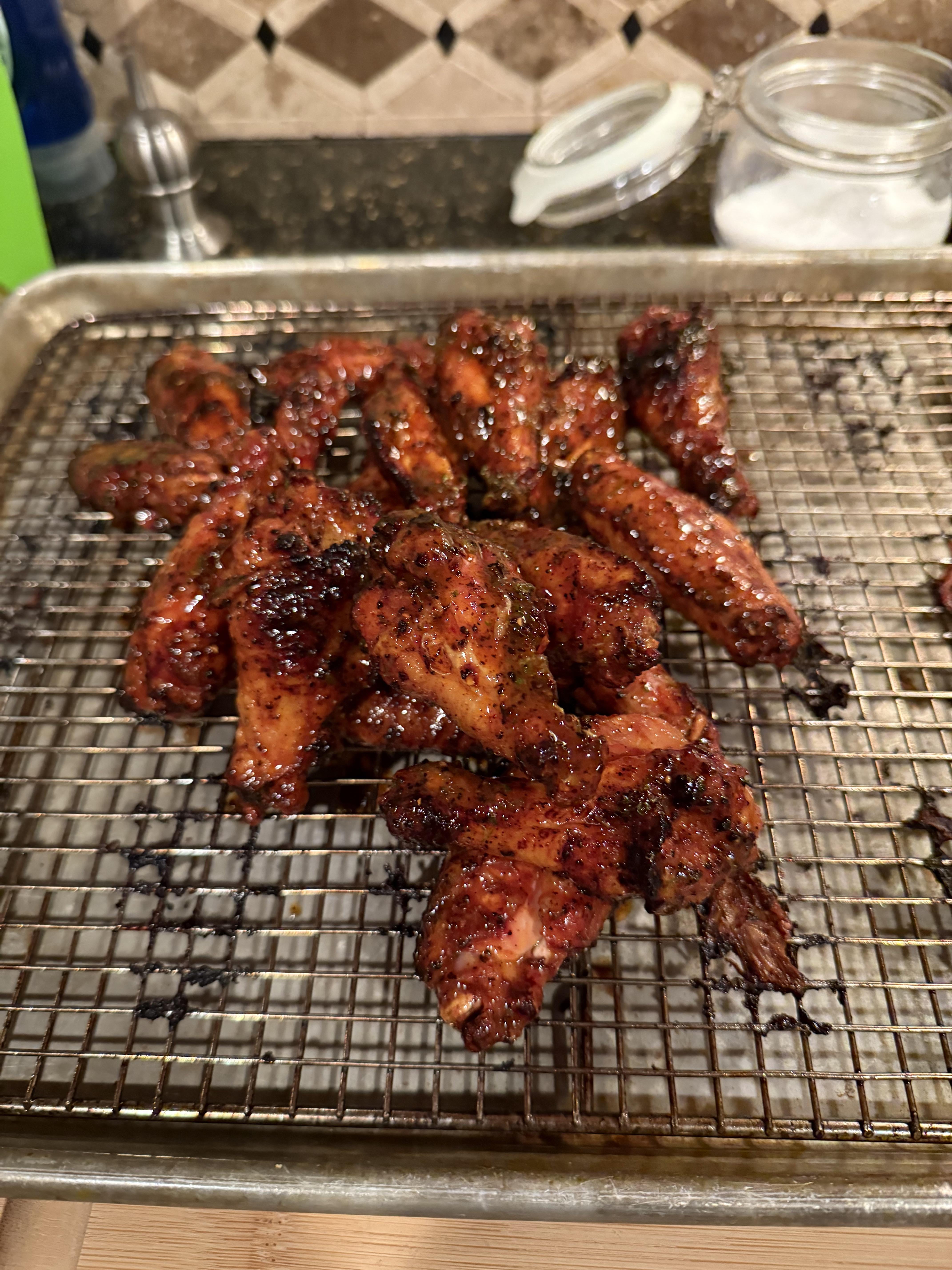 Patted dry, seasoned with salt, pepper, garlic powder, baking powder, and tajin. Pellet grilled/smoked for 20 min at 450 using cherry and mesquite pellets. Flipped then let go for another 10-15 min. Glaze made with butter, franks, tajin, honey, and juice of one lime. Tossed in the glaze with the zest of the lime. Delicious. Would 100% do again!!