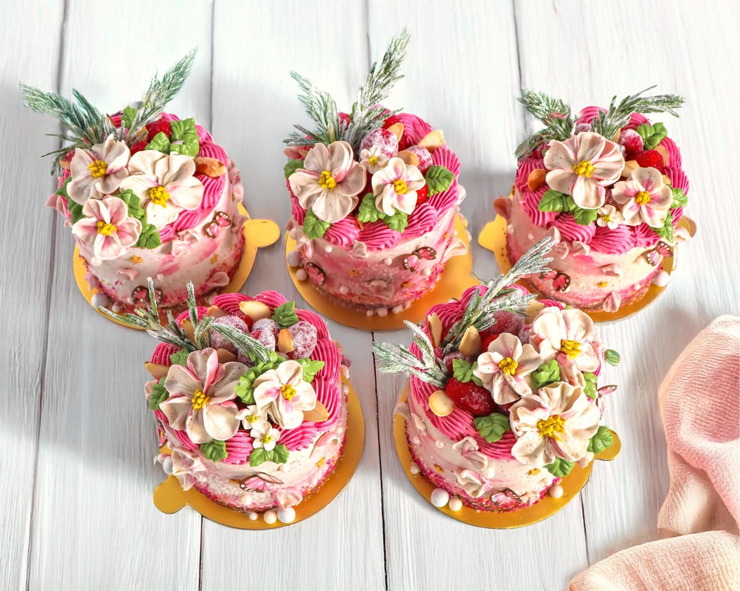 Flavor profile: toasted almond sablé breton bases, brown butter & vanilla bean Italian meringue buttercream, almond & rosemary genoise sponge soaked in amaretto syrup, and raspberry compote. They’re decorated with more buttercream, toasted almonds, and candied raspberries and rosemary sprigs.