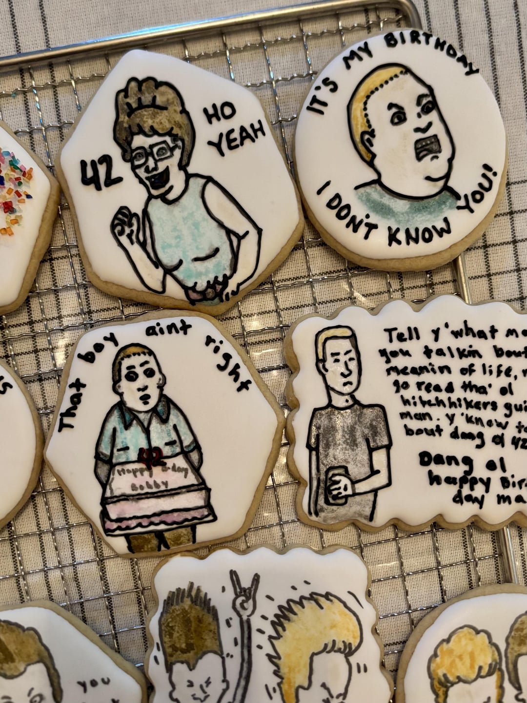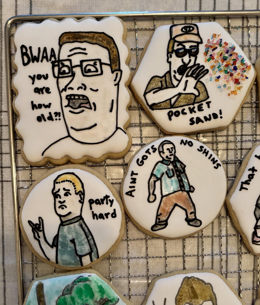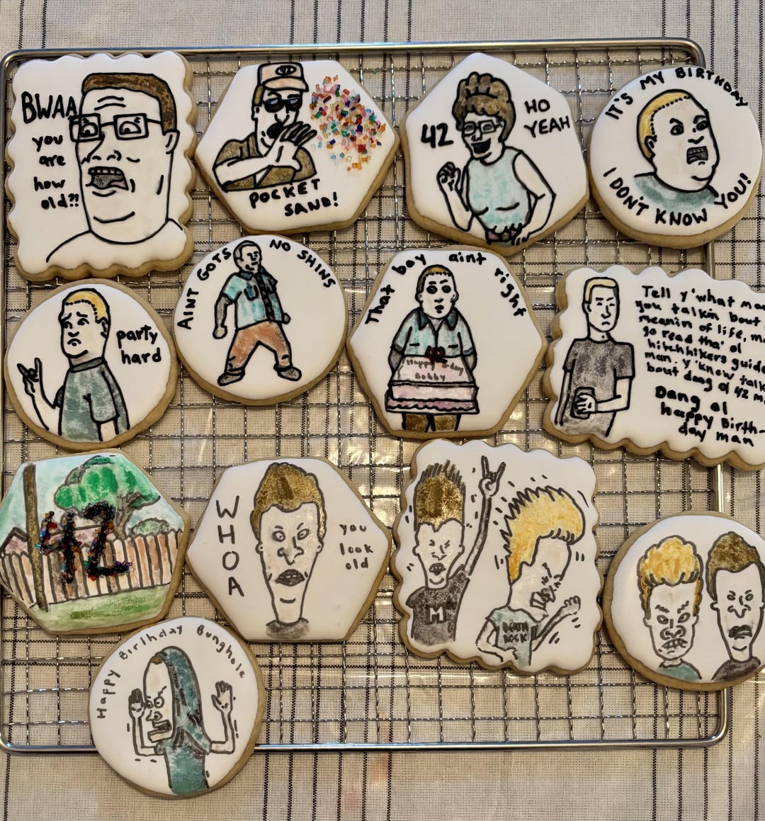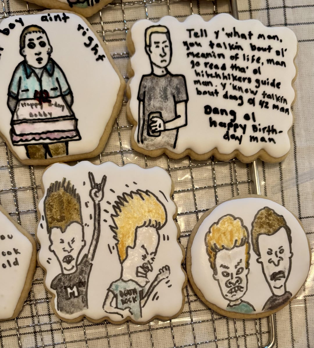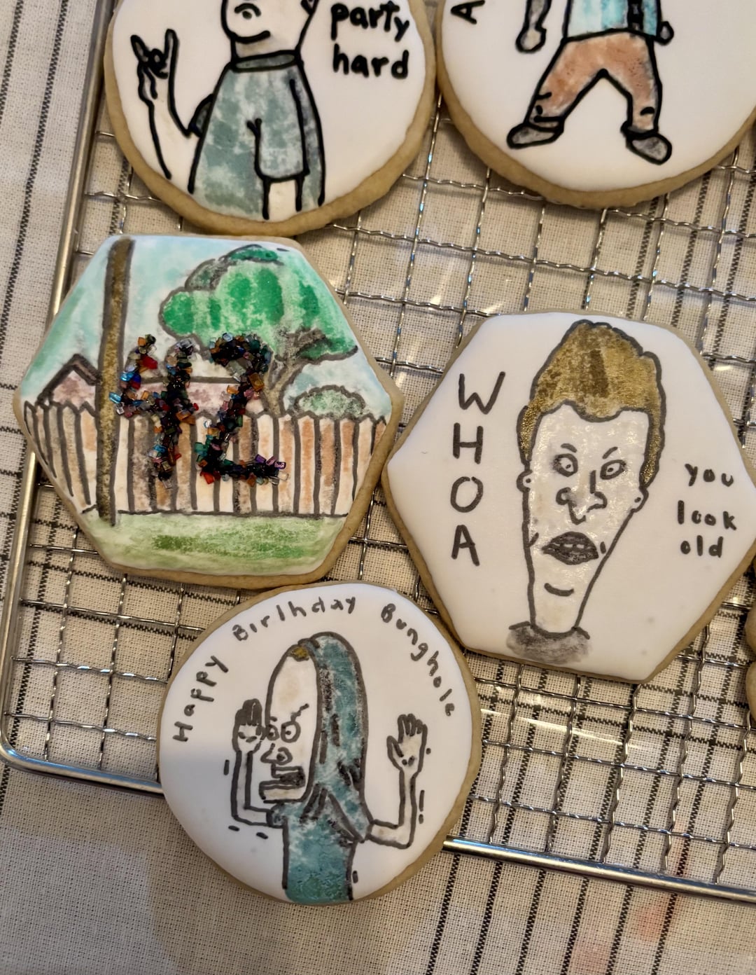 Made for a friend’s birthday- Beavis and butthead ones aren’t done yet. Hobby baker, first time painting on cookies. I’m mostly pleased with how they’re turning out! Some of the colors are bleeding, but not terrible for a first attempt. Any tips on painting cookies to avoid color bleed and splotches?
