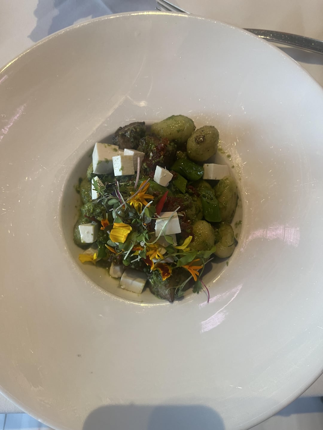 The gnocchi was really tasty! I love pesto so so much and it was nice and plump. I also really enjoyed the sausage, although it didn't look at sausage, i'm used to the regular diner-looking sausage. but overall it was awesome. It filled me up very quickly and i almost couldn't finish it! I'd rate it a 9/10 just cause those little flower things on top were not as tasty.