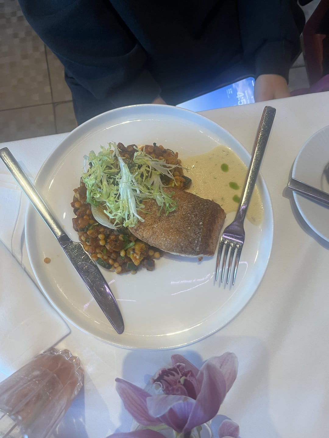 I tried the salmon and it was okay, it definitely lacked a bit of flavor, maybe a tiny bit overcooked? The sauce did make it a bit better, but not as much as I wished. But i love salmon and the skin was super crunchy. The stuff around it, which I don't remember what it was, was also very tasty. a solid 7/10 for me!