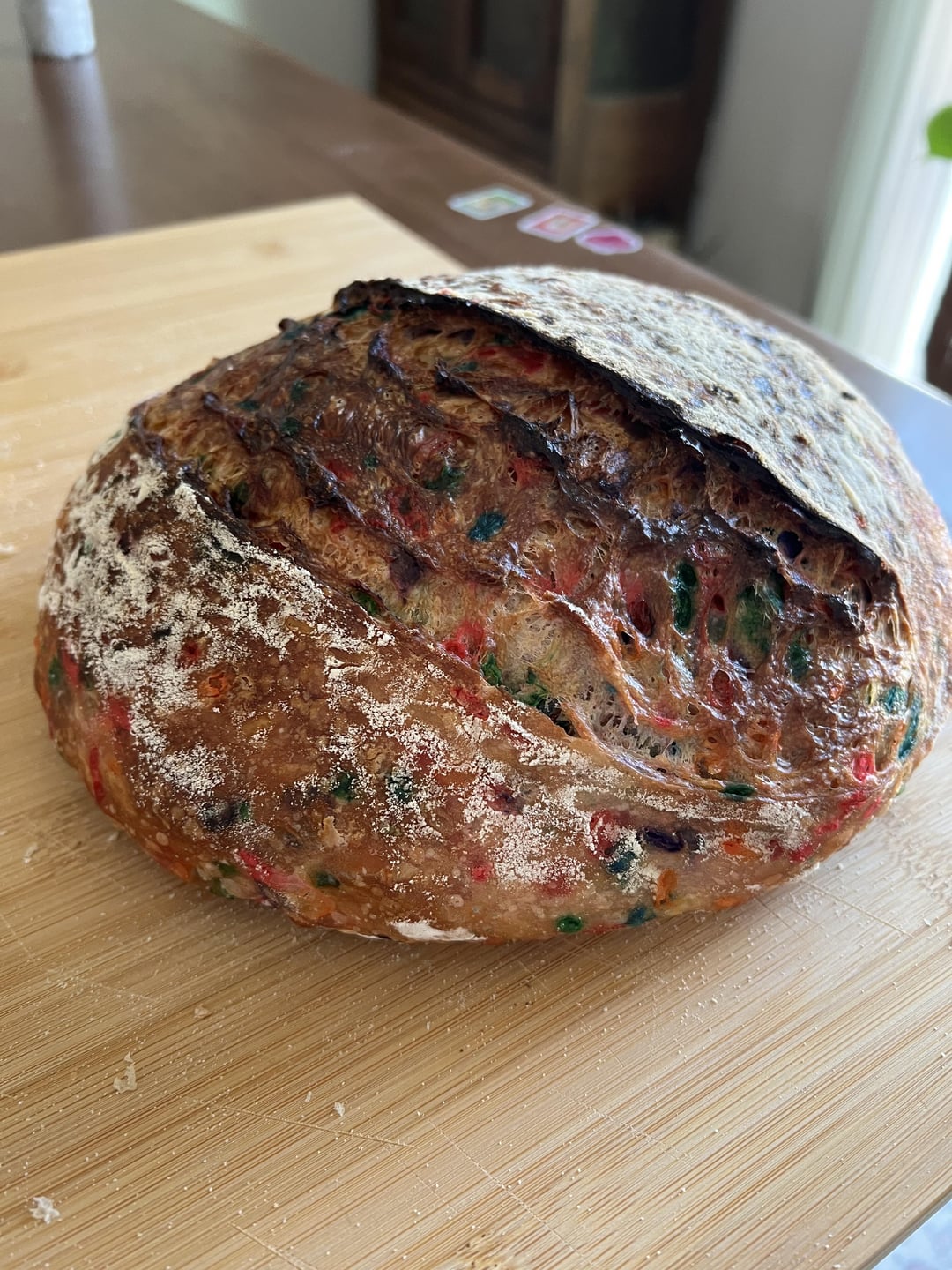 Bulk fermented for 8 hours, shaped and put in fridge to cold proof for 14 hours. Baked at 450 for 20 mins covered, 35 mins uncovered. Let cool for 3 hours.