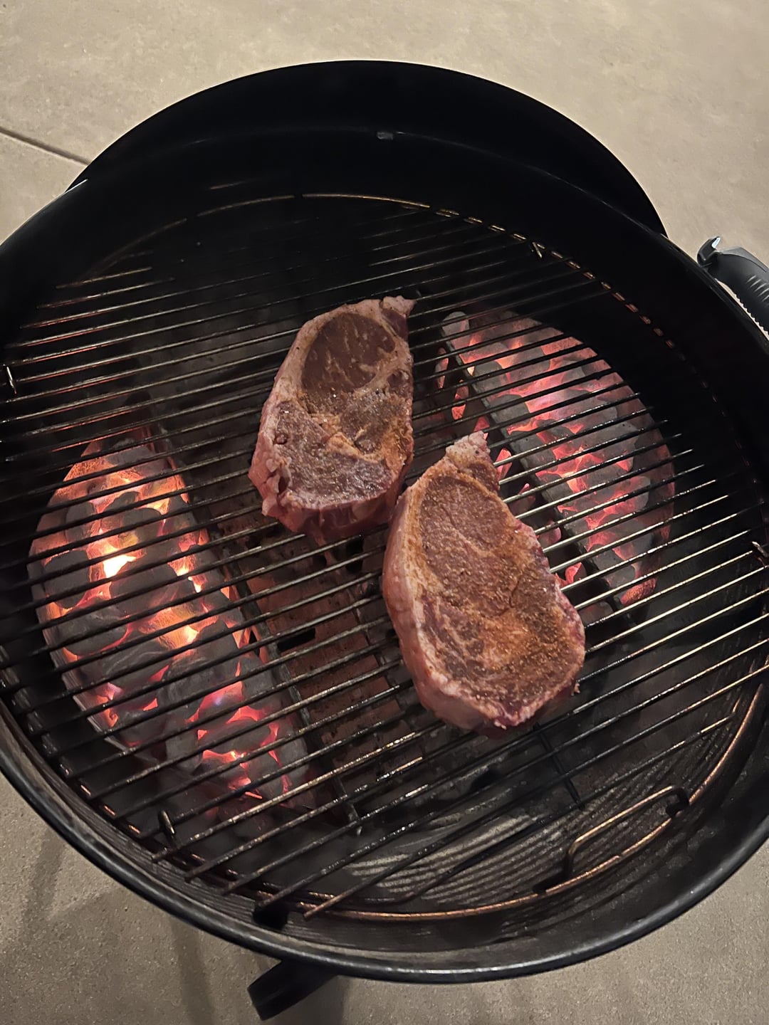 Dry brine with Kosher salt for an hour. Season with Bullshit seasoning. Indirect for about 20 minutes, sear for a few minutes a side. 👌