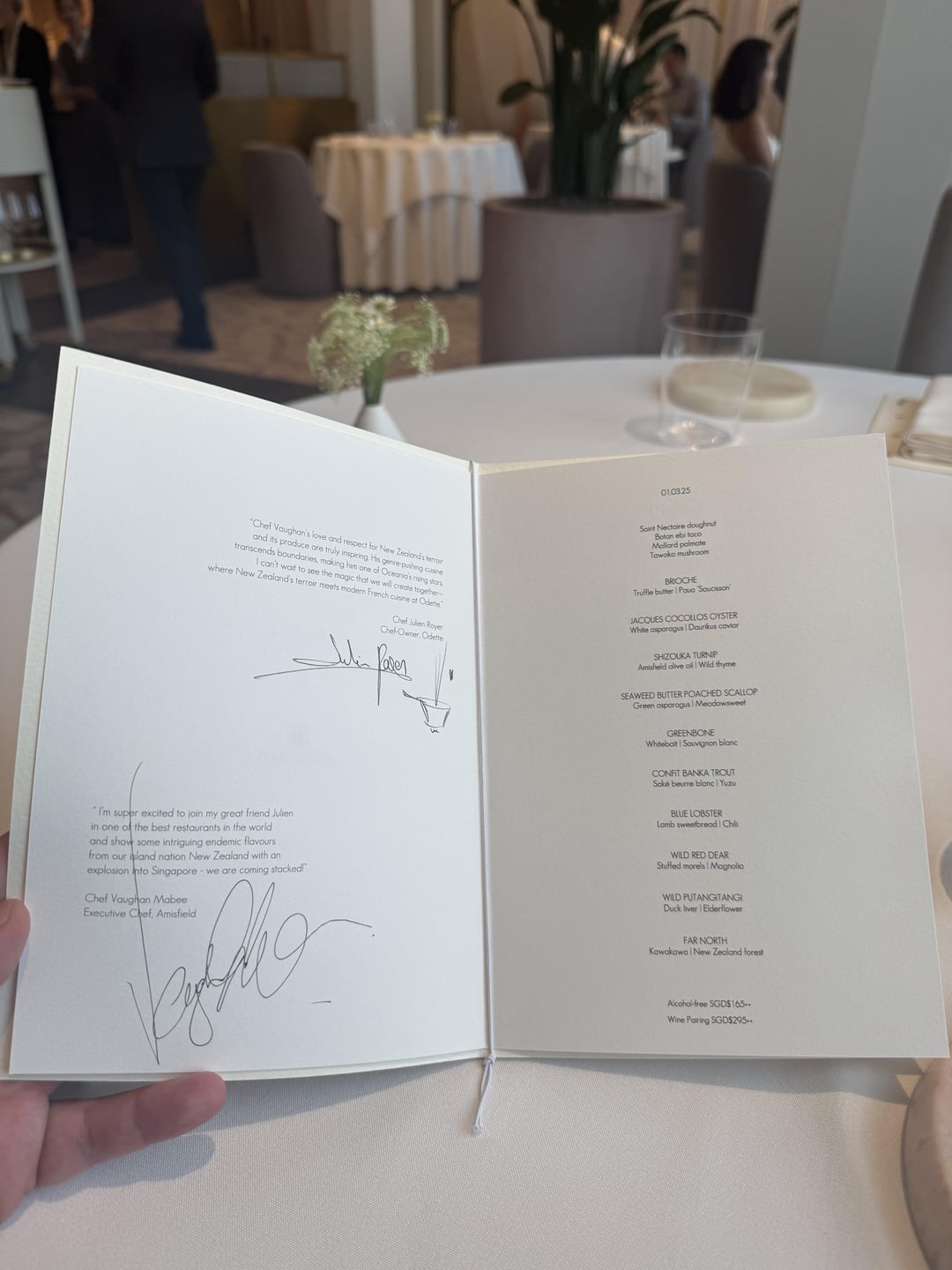 This was nothing short of phenomenal! They perfectly presented what we were informed as Odette classics while collaborating with the team from New Zealand who more than honored their local NZ ingredients they brought to highest level. Perfect pairings with Amisfield’s array of wines was the exclamation point to a 4+ hour experience. Top 3 meal of my very lucky edible life. Cheers to both!