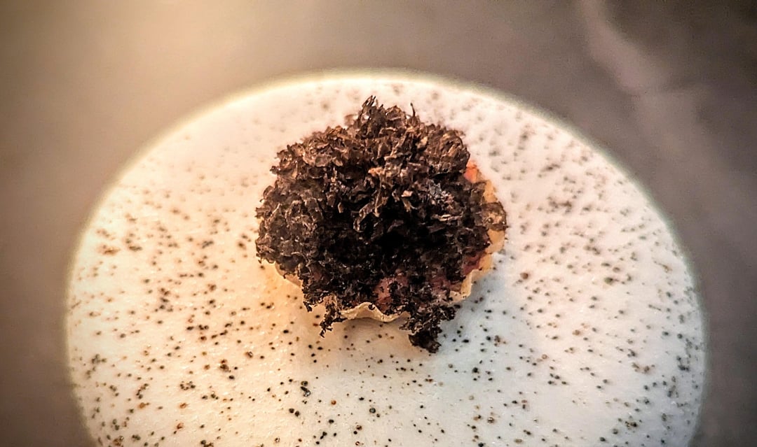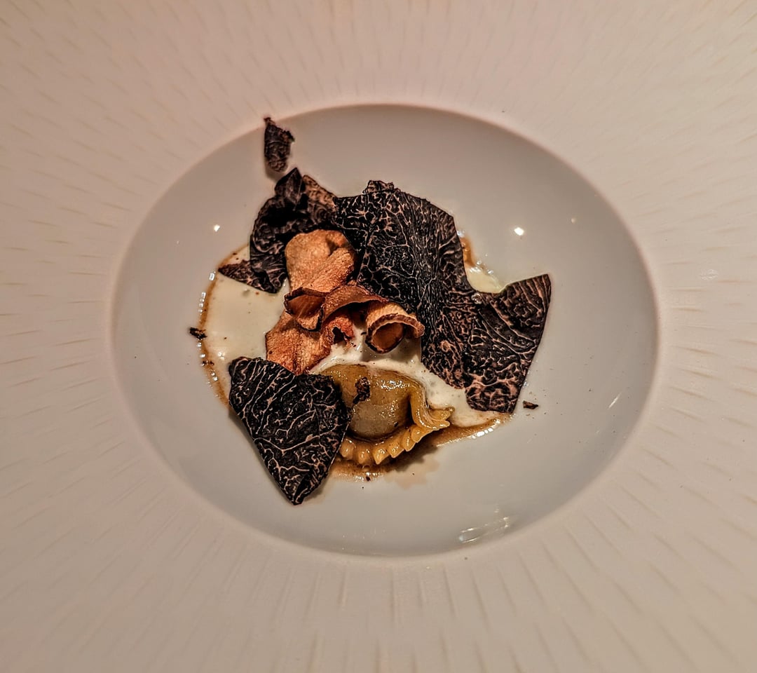 - Jerusalem artichoke, agnolotti, parmesan, sherry vinegar, coffee, black walnut, black truffle
