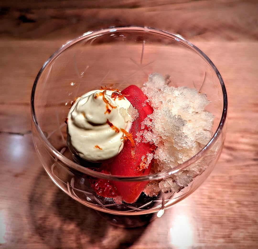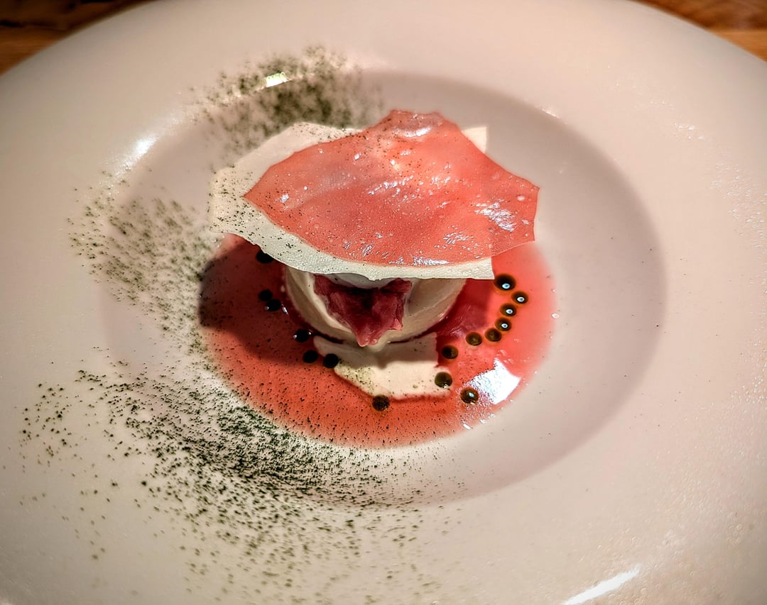 - Duck liver, cherry, coco nib, chervil, pumpkin, oxalis.