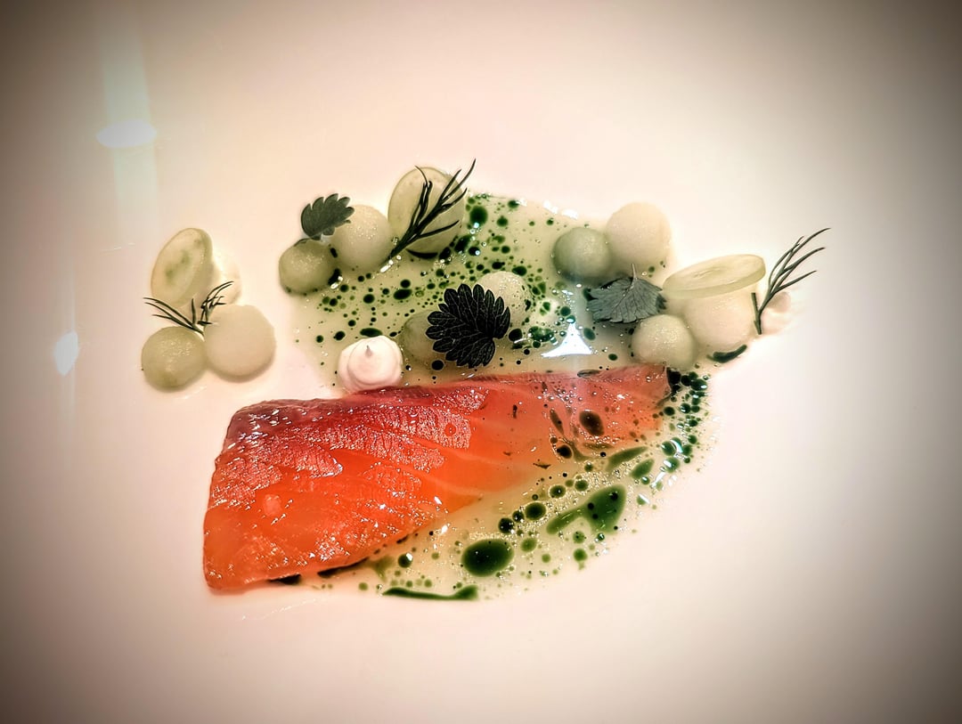 - Trout, apple, grapes, cucumber, dill, yuzu yogurt, salad burnet