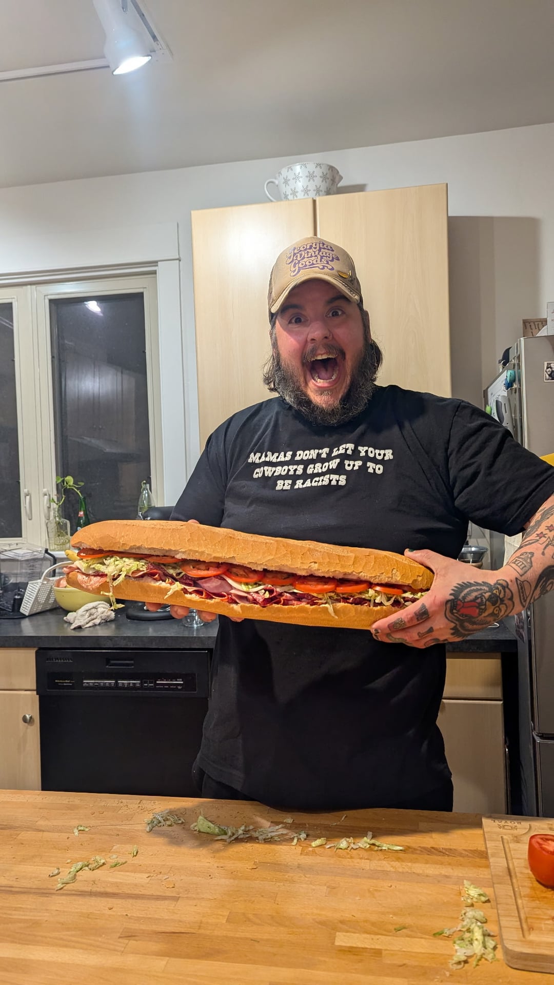 Amazing shirt! I have one that says Mamas, don’t let your cowboys grow up to be babies. Would eat that entire sandwich!