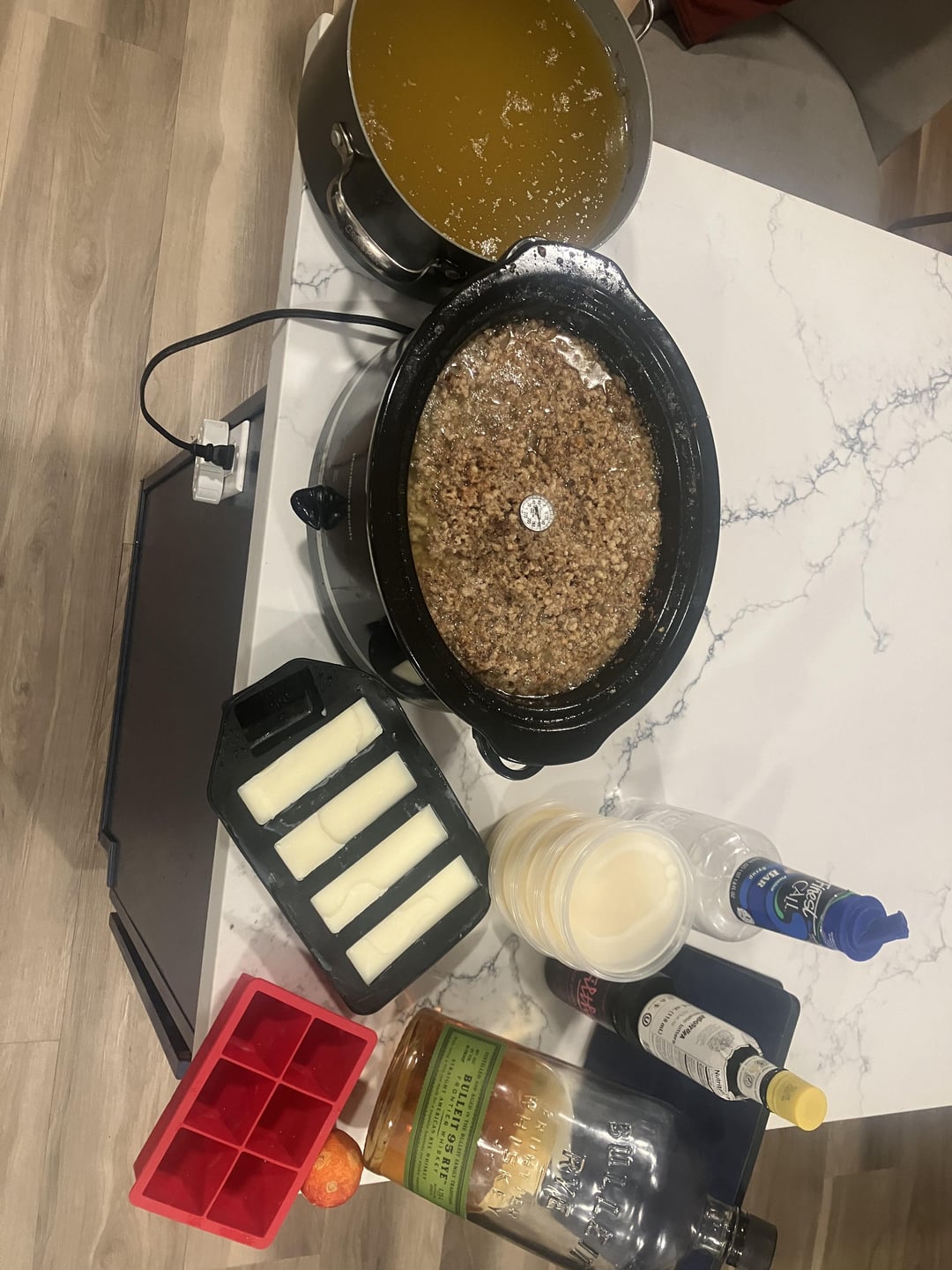 I think I may get over a gallon of yellow/white gold in total. Made some into sticks to use like butter. Eggs cooked in tallow anyone? A quart went into 8oz containers to use for shallow frying. I’ll strain the big pot and freeze it all for deep frying later. And I still have a crockpot full of corse ground bits that are holding onto that last bit of fat. The rendering began with a nice and filthy Bulleit Old Fashioned with a twist of blood orange peel. The question is, do I have another before I head to bed?