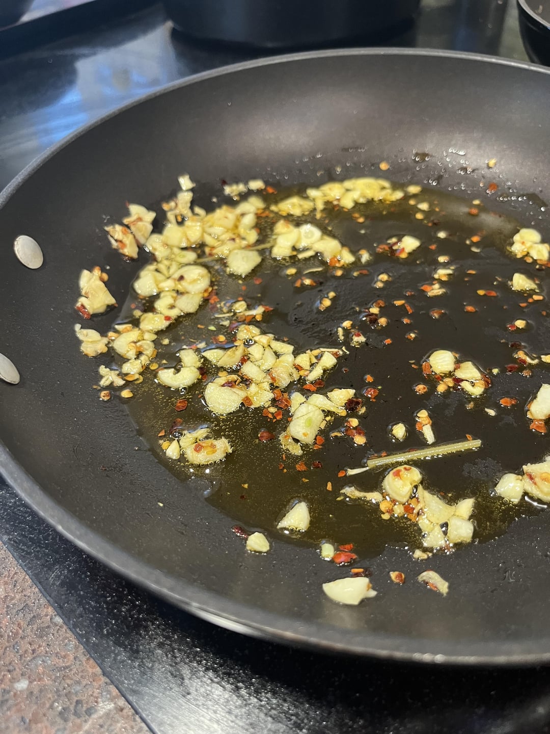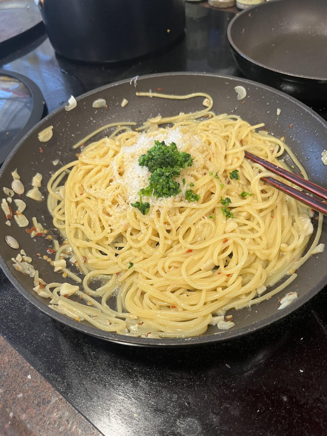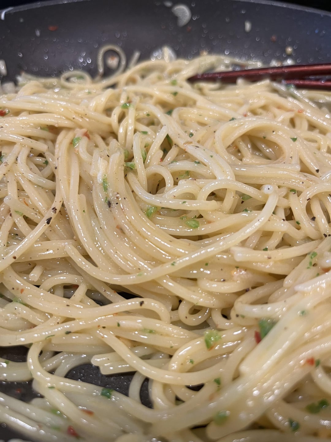 Basic aglio e olio: evoo, 1-3 tbsp probably more 2-4 garlic cloves, chopped Pinch or 2 of pepper flakes 1/3 lbs spaghetti 1-2 tbsp parsley 1-3 oz parmegiano reggiano salt pasta water toast garlic and pepper flakes in evoo, add small amount of water with pasta and cook it in the same pan so starches incorporate until fully cooked. add chopped parsley and cheese and mix n enjoyyy