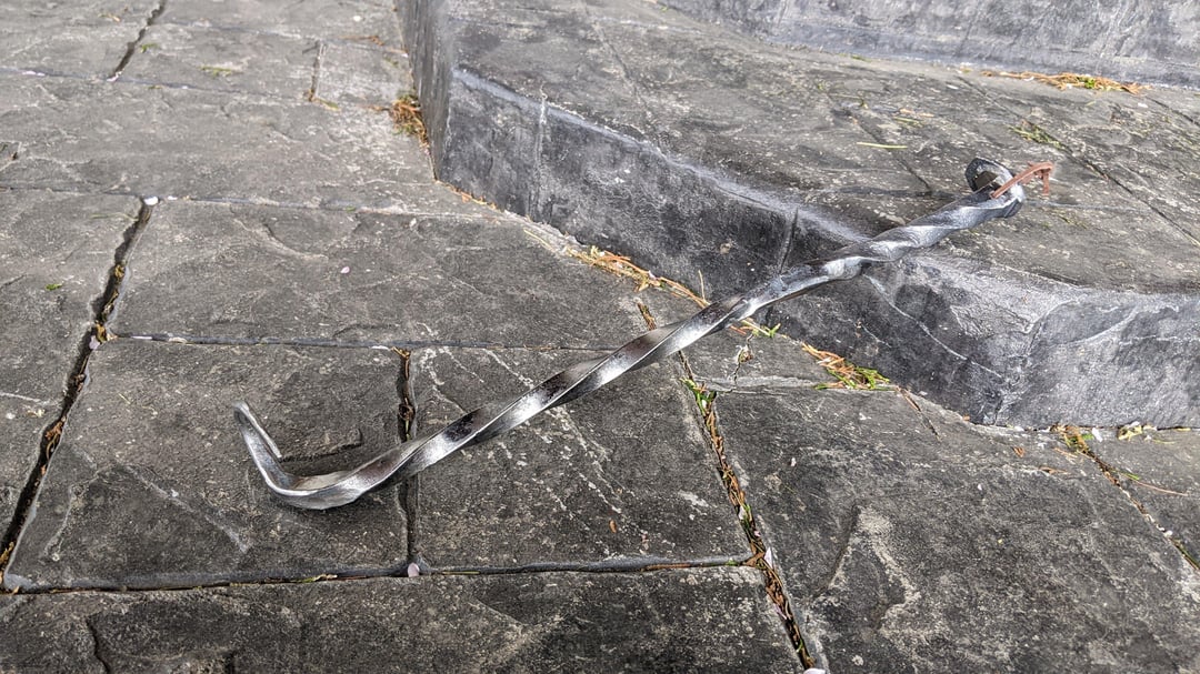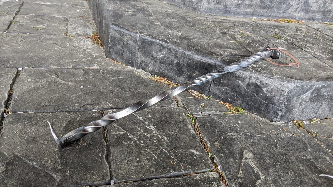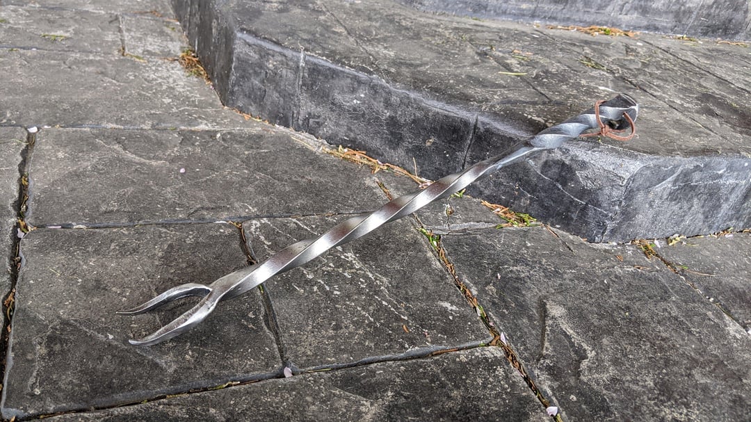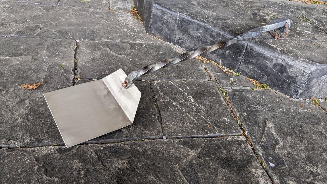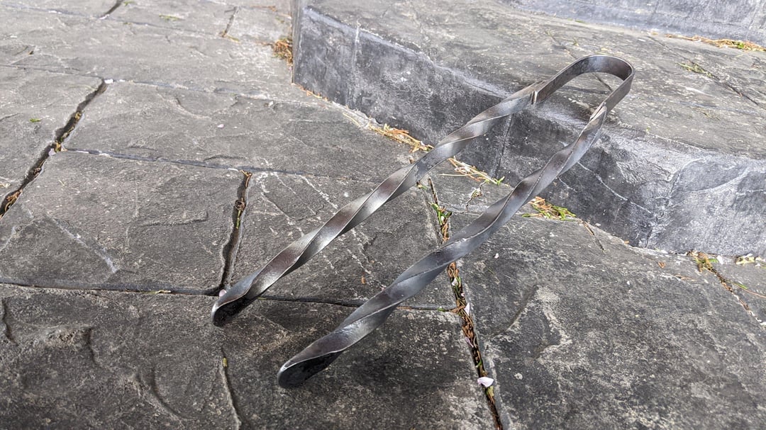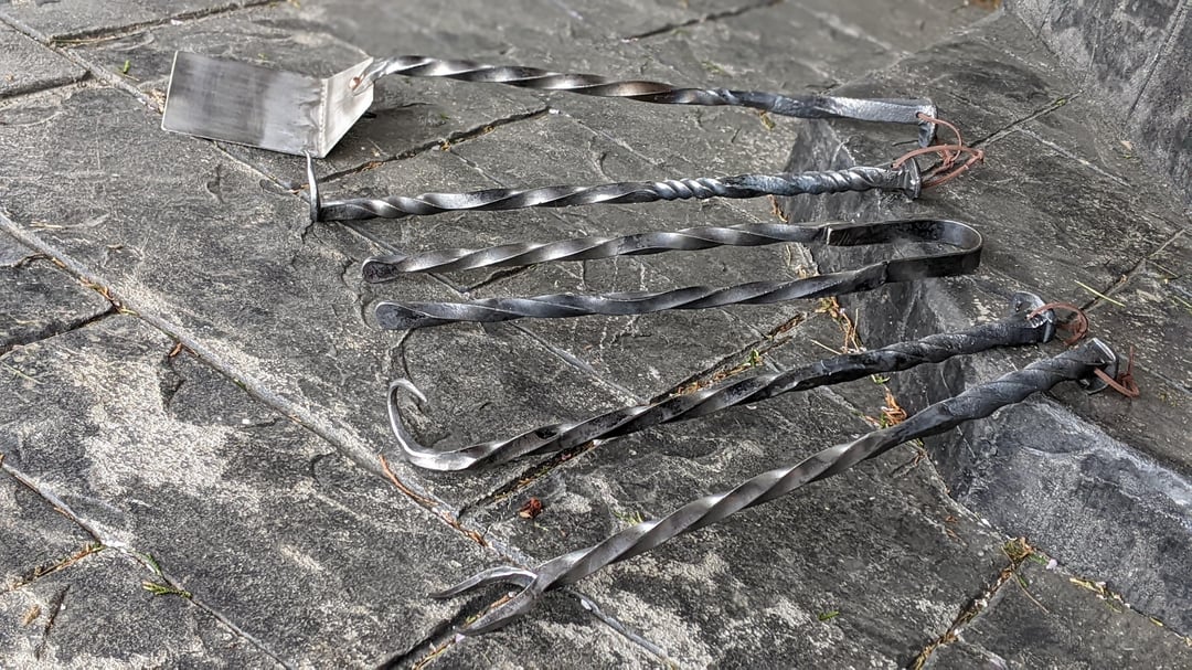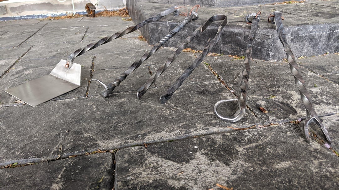 As a followup post to my other one about grilling related goodies I make in my home blacksmith shop, check out a project completed last summer: A full BBQ set made from railroad spikes, old railing, and other scrap! Fork, Tongs, Left and Right-handed meat flippers, and a stainless spatula.