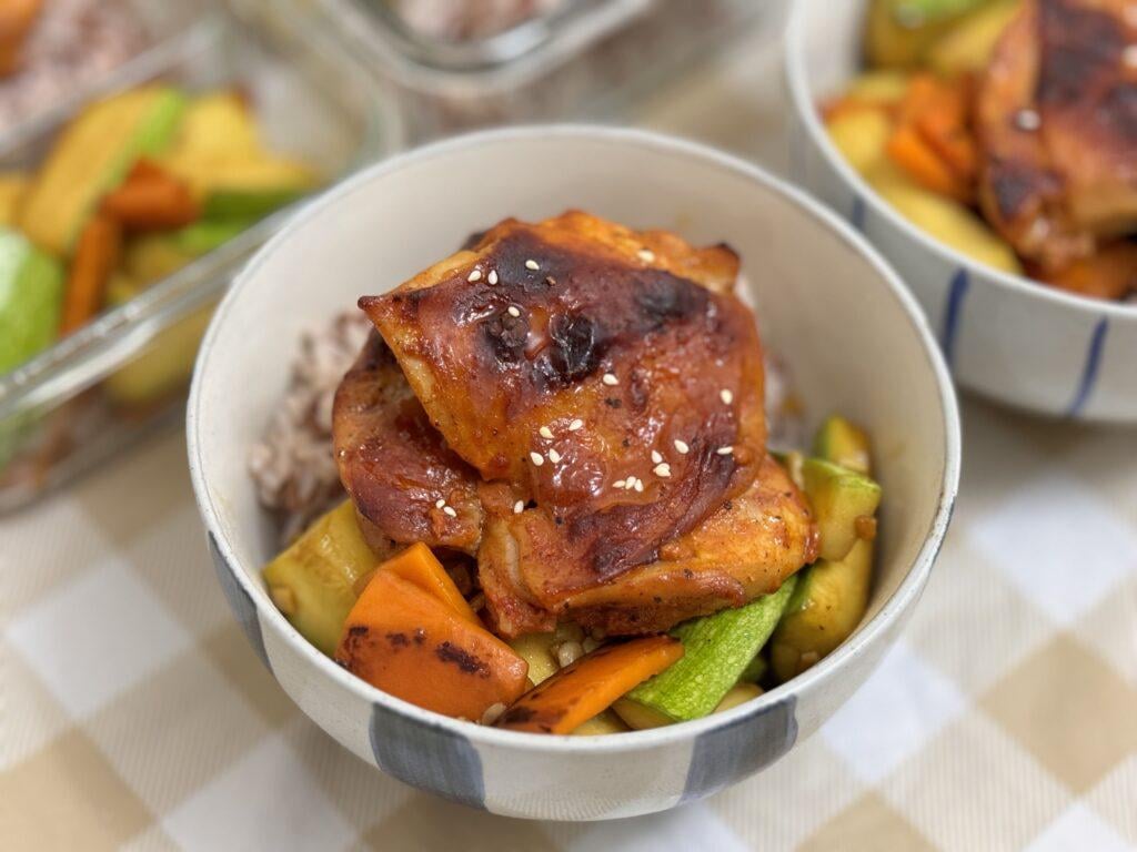 Savoury, sweet and sticky heat come together in this meal-prep friendly, minimal effort recipe for oven roasted chicken thighs.