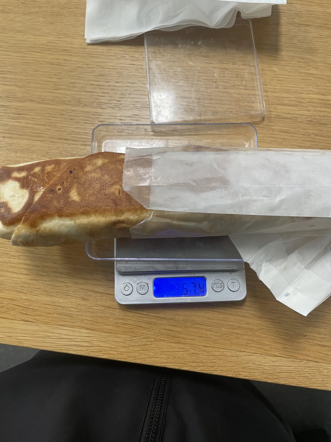 357g for the whole thing, 165g of chicken after oppening it, managed to identity their bread 310kcal/100g 450g per packets 6 wrap per packets. This is my estimate, i am invited there in two days as well really need a good estim