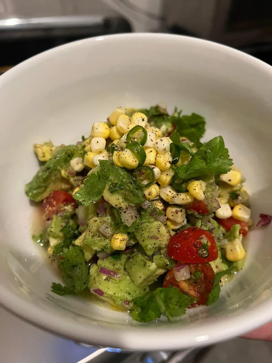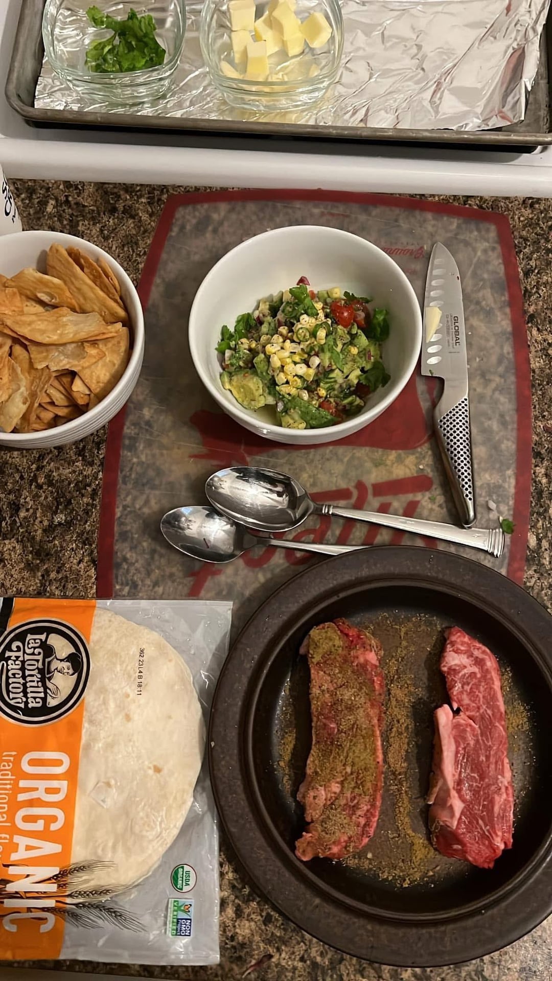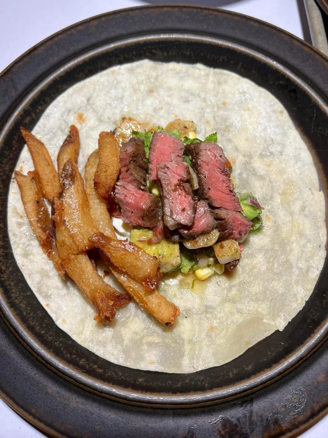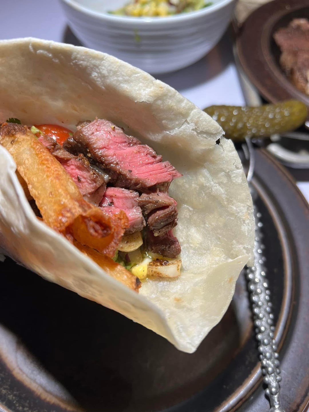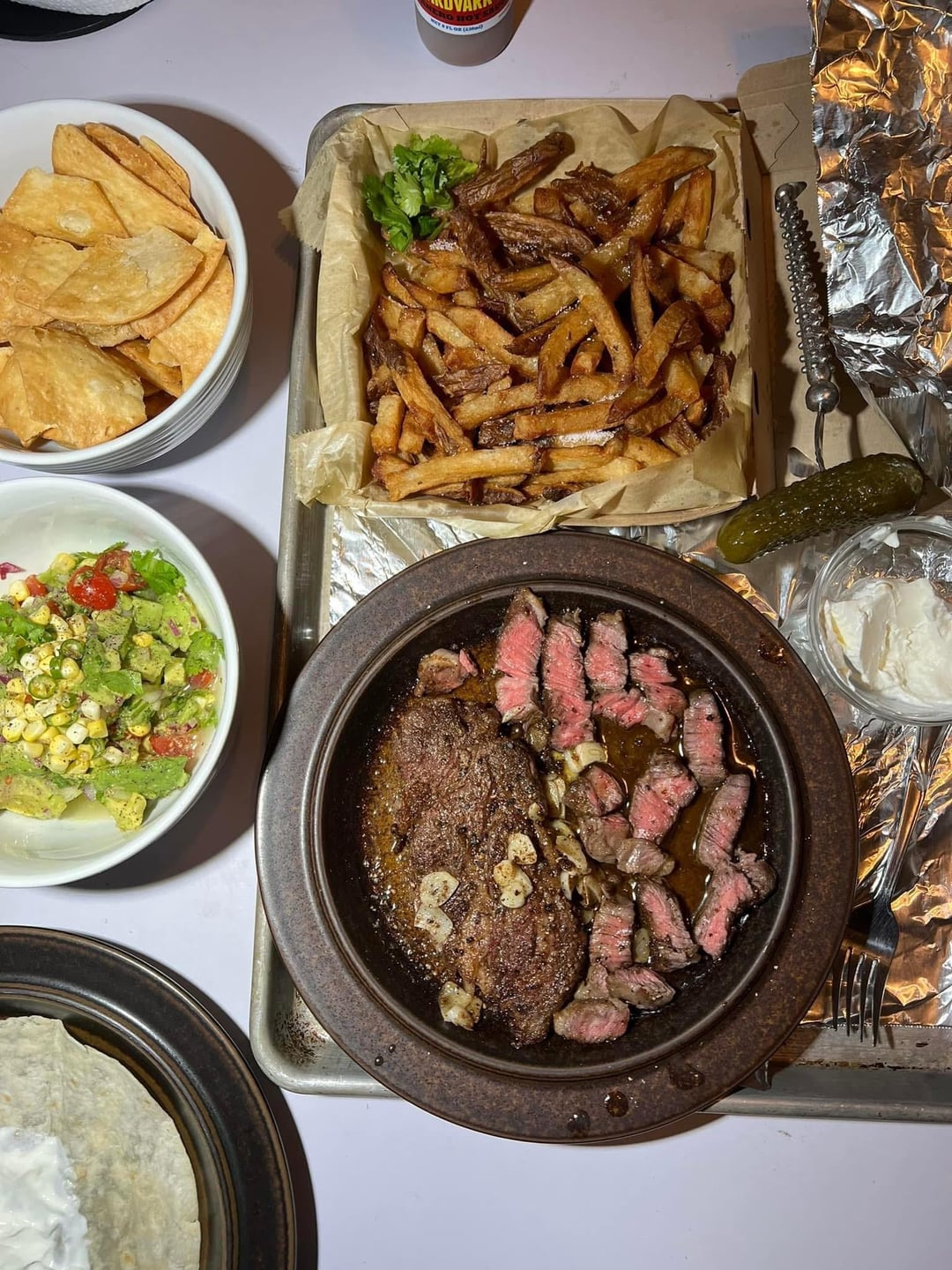 Chuck eye seasoned on one side with Japanese montreal steak seasoning, coriander, and cumin with pickled corn and Thai chilis guacamole, truffle fries, and sour cream flour tortilla taco with a bubbies spicy pickle on the side