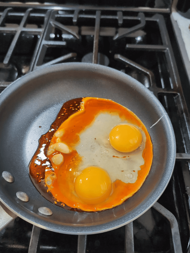 I found this really bland with Laoganma. I would much prefer to fry the eggs in regular cooking oil then put the chili crisp on after.