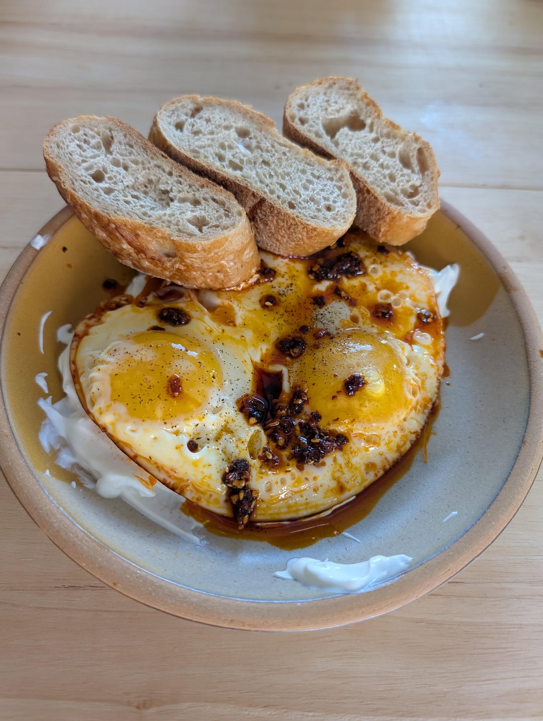 Made Kenji’s eggs fried in chili crisp served over labneh