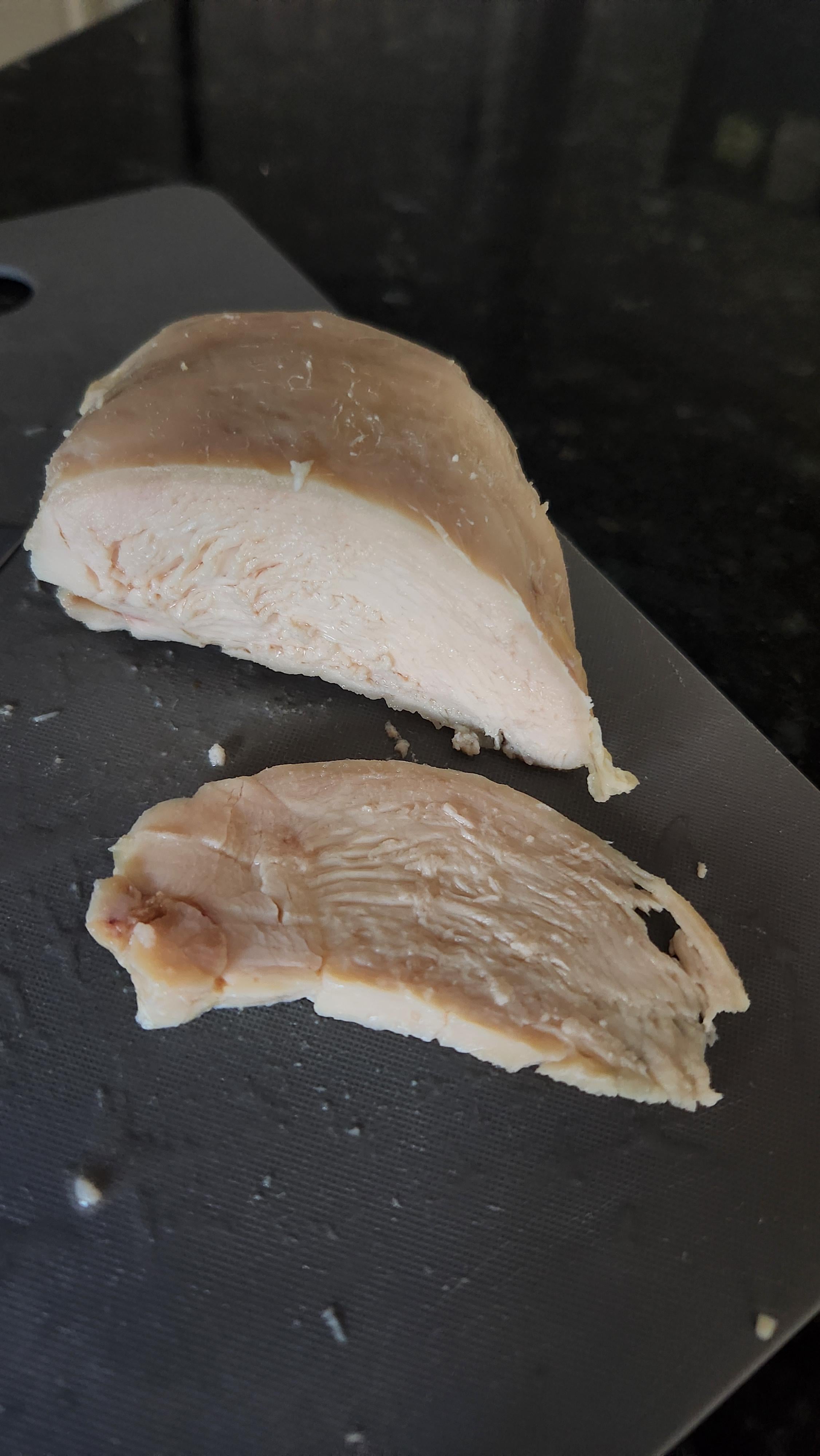 Texture is kind of stringy and drier compared to my results from the previous day (147F, 3h). Everything else was kept constant aside from the day. Using a new Inkbird 200W, Ziploc bags using the underwater sealing method both times while I wait for my vacuum sealer to arrive. Added 1% kosher salt by weight as well. Both are from the same pack of Kroger chicken breasts.