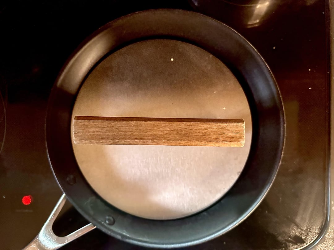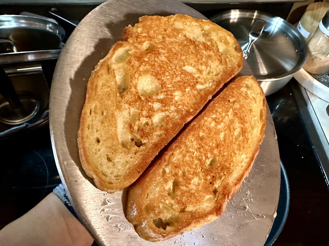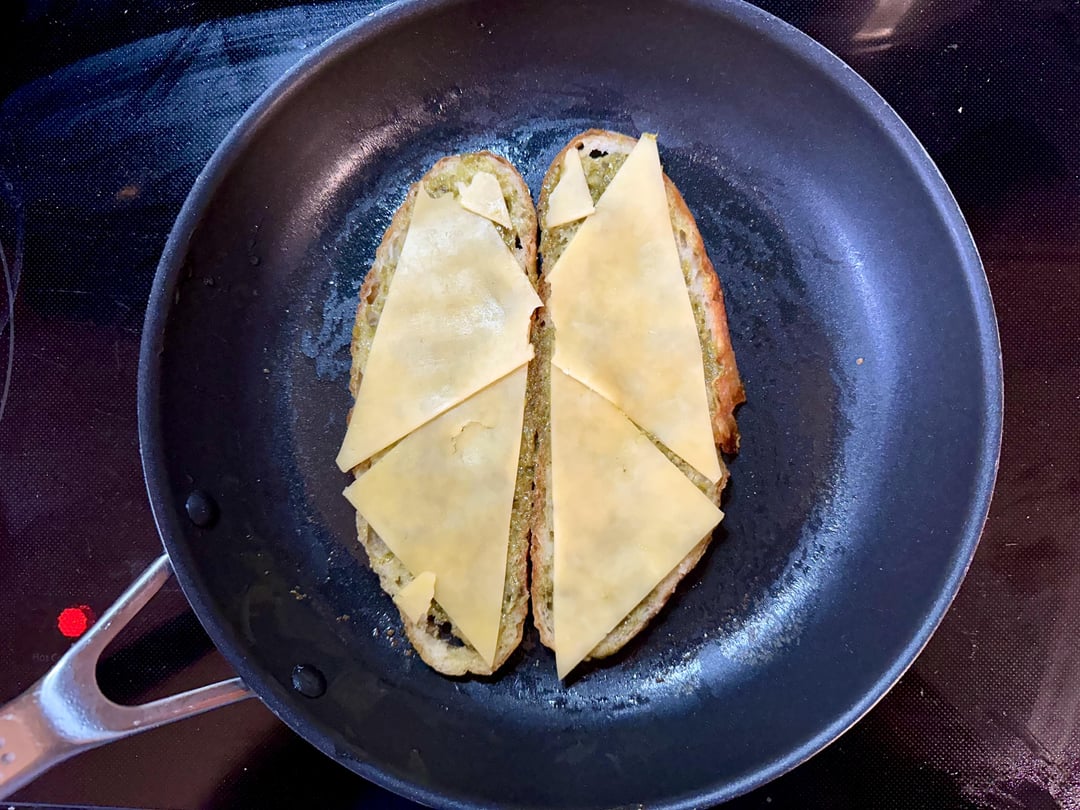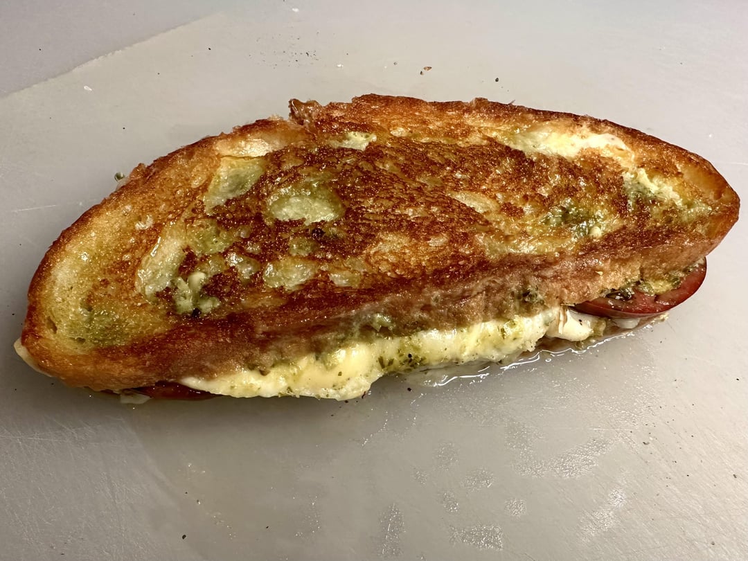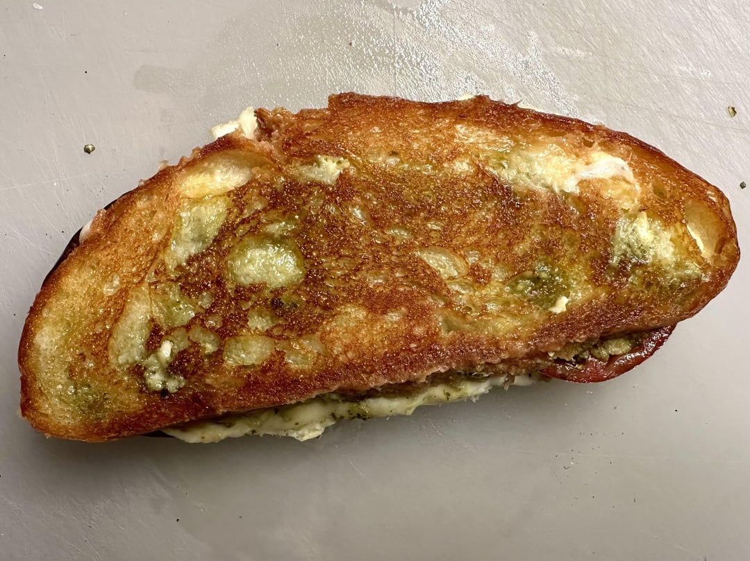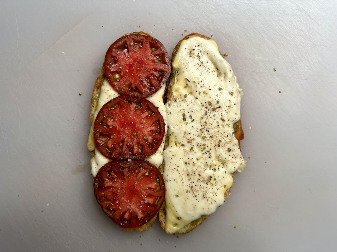 Homemade no-knead rustic bread, Kerrygold butter, pesto, Gouda, fresh mozzarella, salt, pepper, dried oregano, and heirloom tomato. Used a weight to get a nice crust and melted the cheese in the oven.