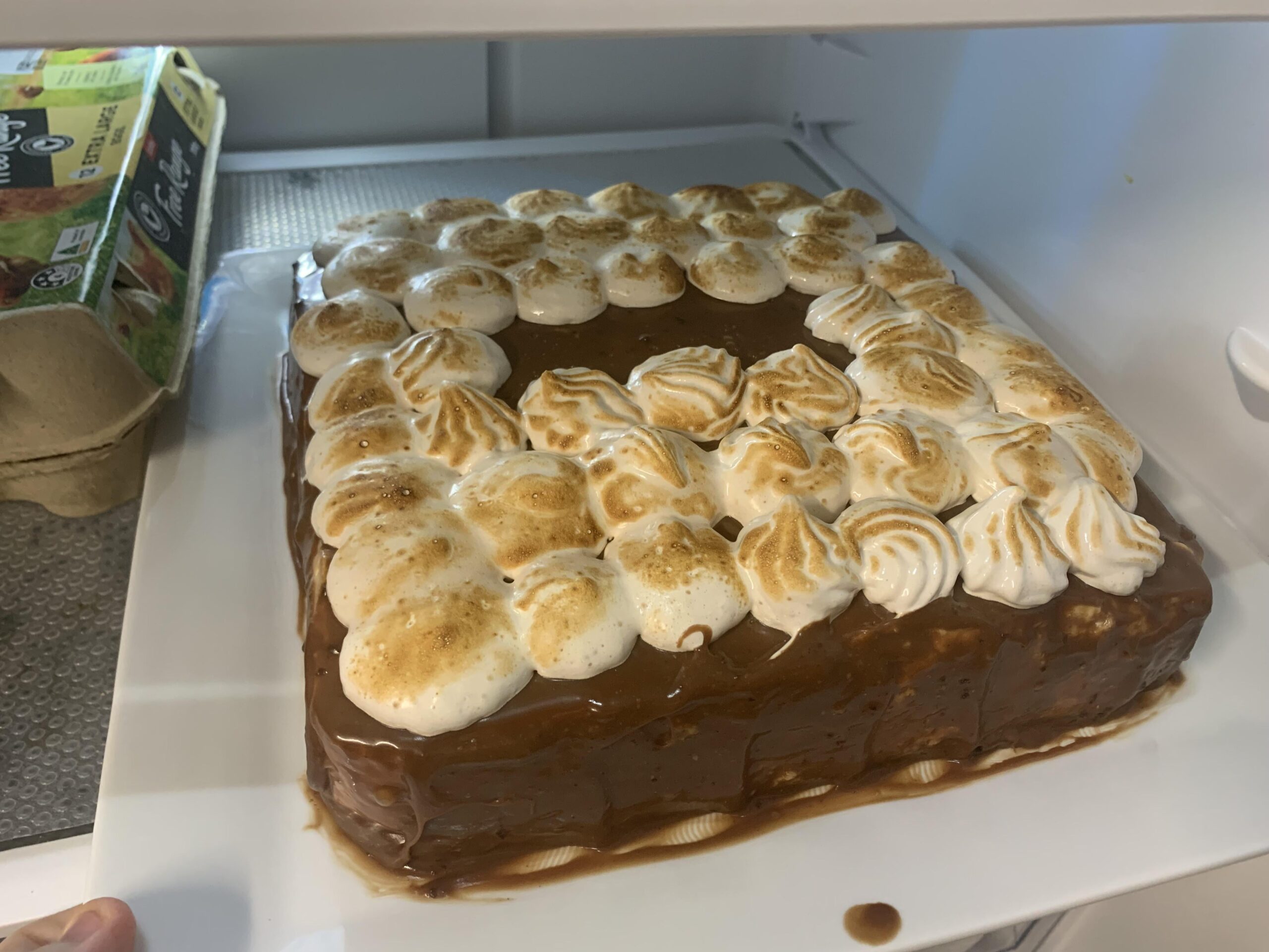 My mother’s 60th birthday cake. White chocolate cheesecake with chocolate ganache and ahh… Italian meringue on top.