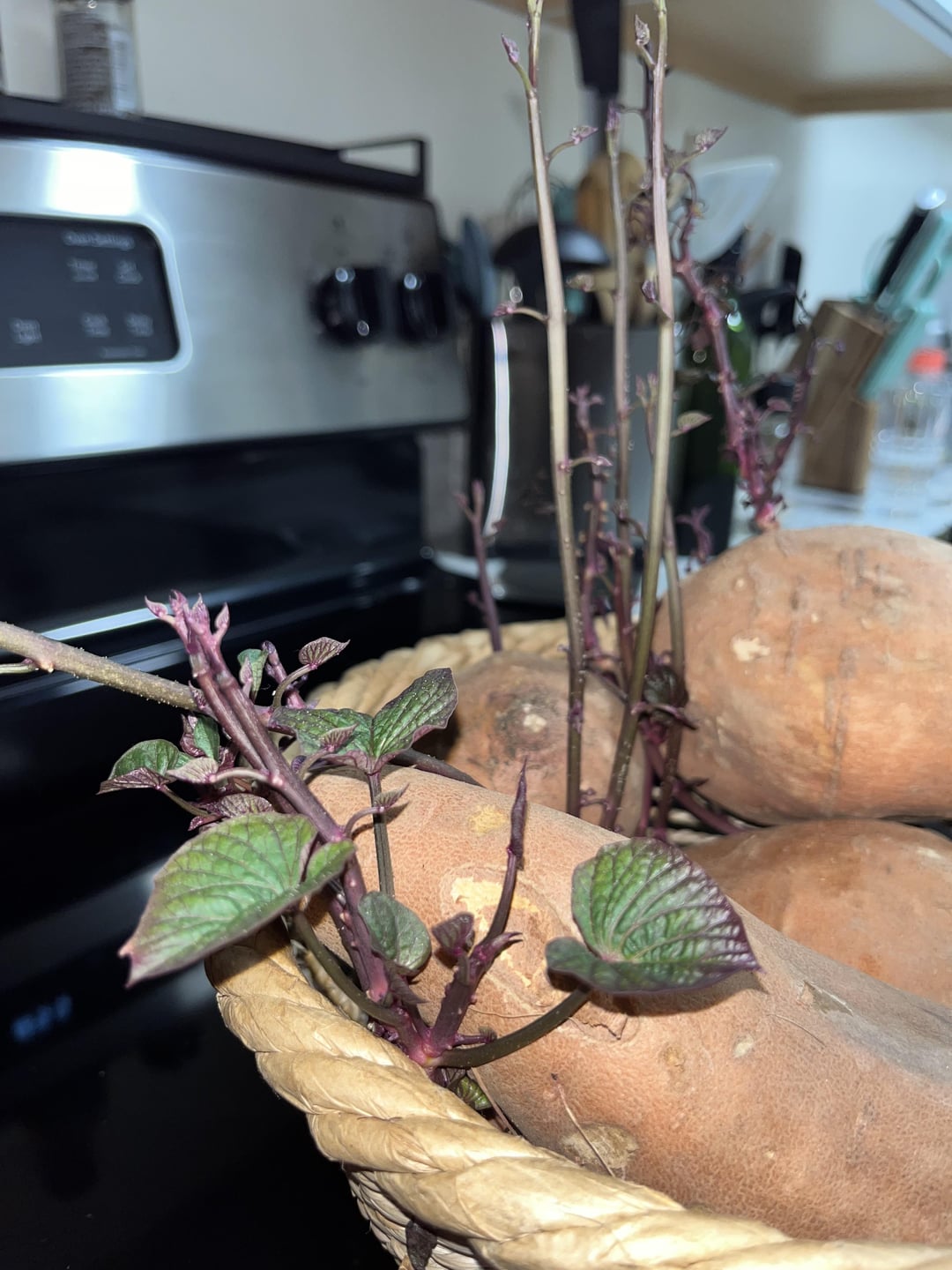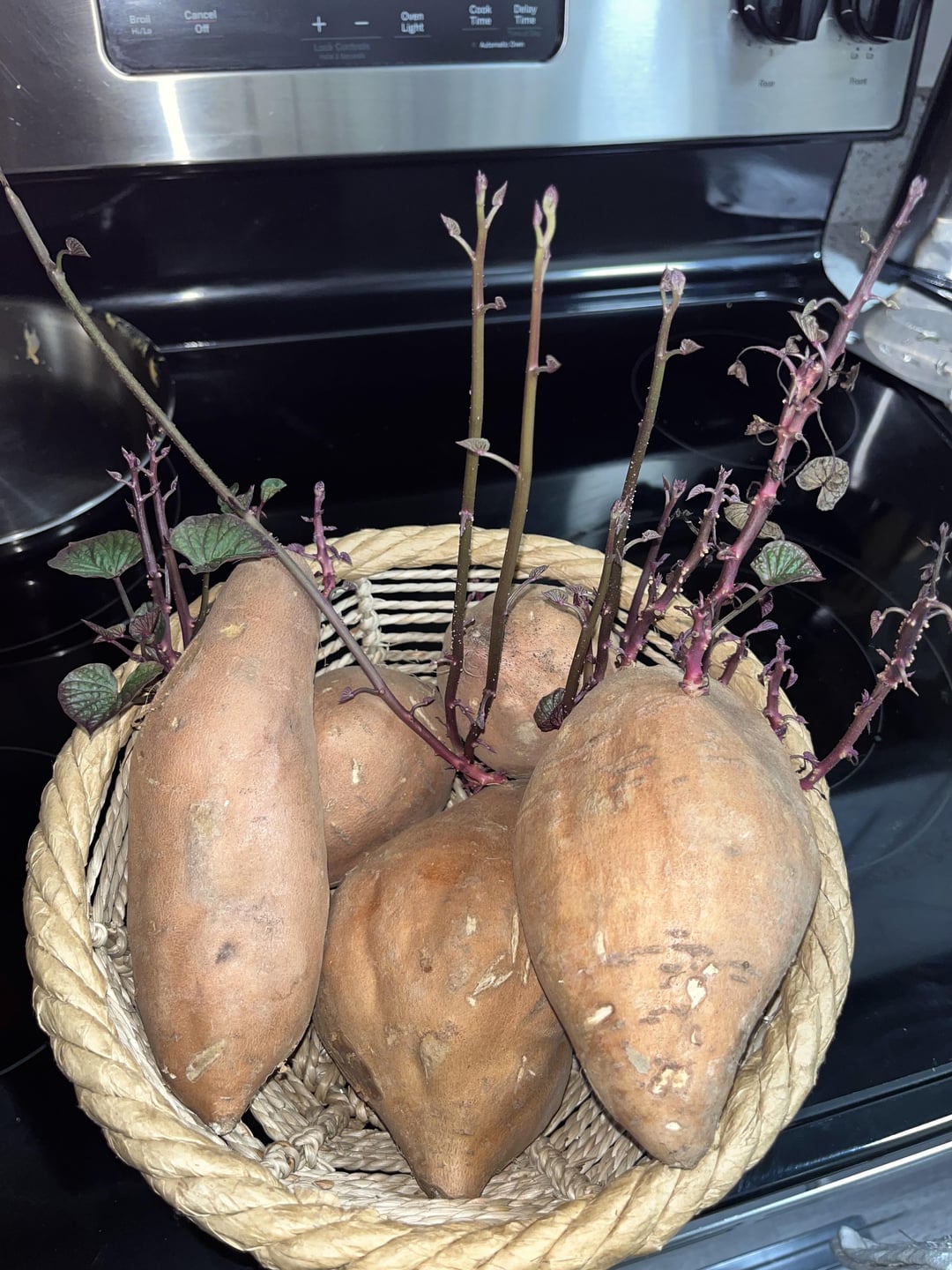 So I was out of the country for about a month. I came back and I saw my Sweet Potatoes had something growing out of it! Decided to let it grow, this is what they look like about 3-4 months later! 😅